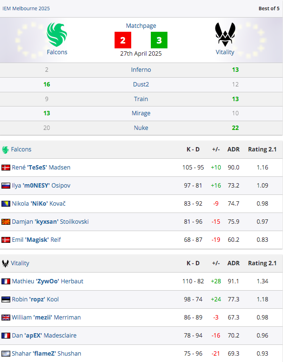 В какой-то момент на dust2 у “соколов” что-то кликнуло, и они забрали 7 раундов из 8. Дело дошло до овертайма, в котором Falcons выиграли все 4 раунда. И вот она - первая карта, проигранная Vitality в Мельбурне.
