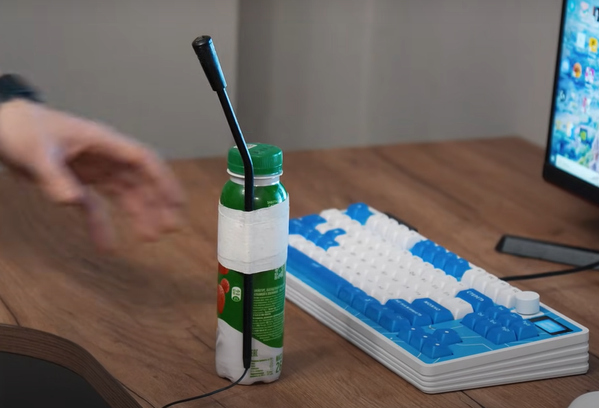 А вот так выглядит микрофон стримера Aceline AMIC-1 за 300 рублей. Да, он привязан к бутылке от йогурта.