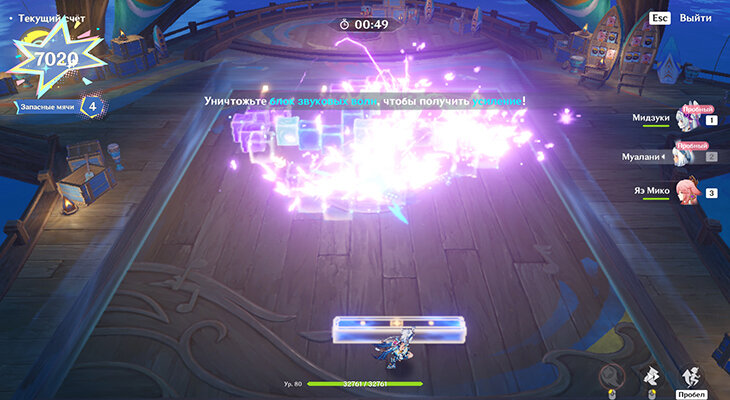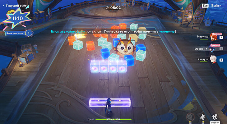 За разрушение блока звуковых волн ширина платформы увеличивается. На этом этапе босс получает урон от реакций Заряжен и Перегрузка, поэтому возьмите в отряд сразу четырех персонажей – Пиро, Гидро, Электро и Анемо. Самое сложное на этом этапе – уследить за 5 шариками одновременно. Если потерять их, счетчик мячей не изменится. Просто ждите появления следующих музыкальных блоков, если потеряли все шарики.