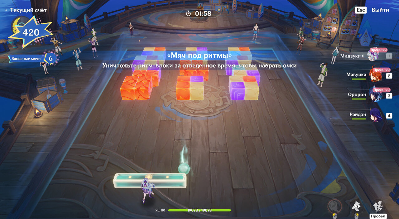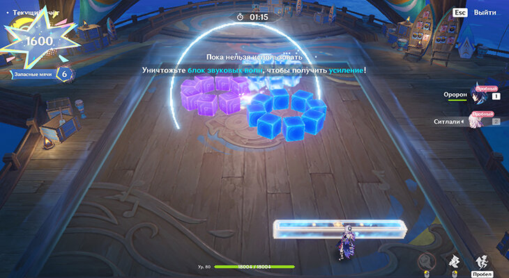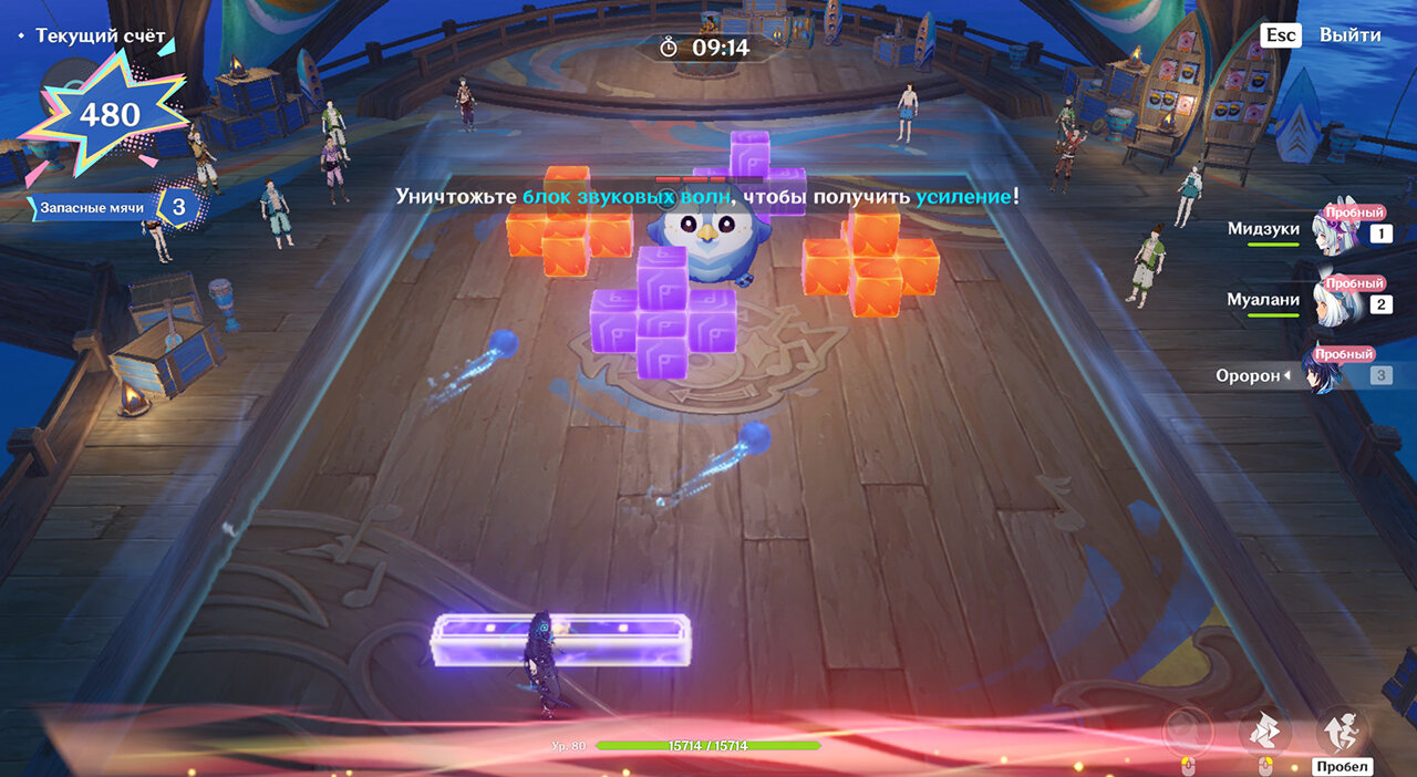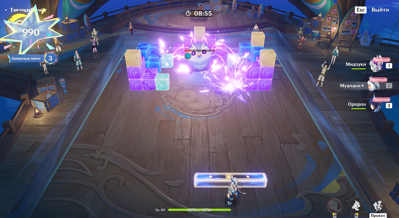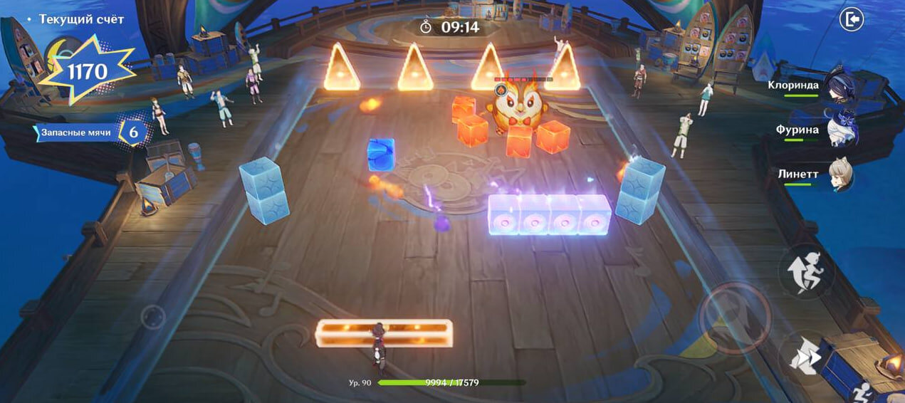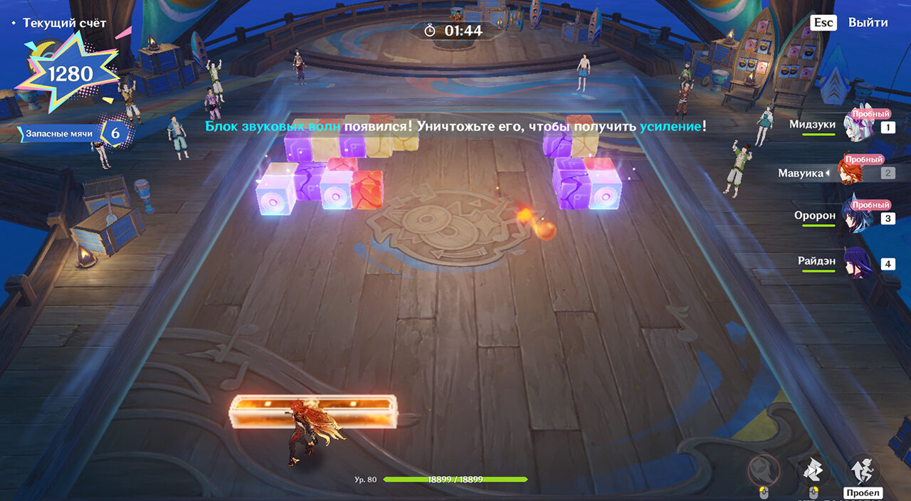 При переключении блок принимает стихию стоящего за ним персонажа. Возьмите Пиро или Электро, ударьте блоки, а потом с помощью Анемо распределите их стихию Рассеиванием на соседние блоки. Так будет проще взрывать большое количество блоков сразу. Когда вы рассеете Пиро/Электро, а потом ударите Электро/Пиро, возникнет Детонация – за нее и начисляются очки. Если мяч сперва наделить Пиро, он ничего не заденет, и вы дадите ему Электро (и наоборот), то он будет лететь уже с Перегрузкой.