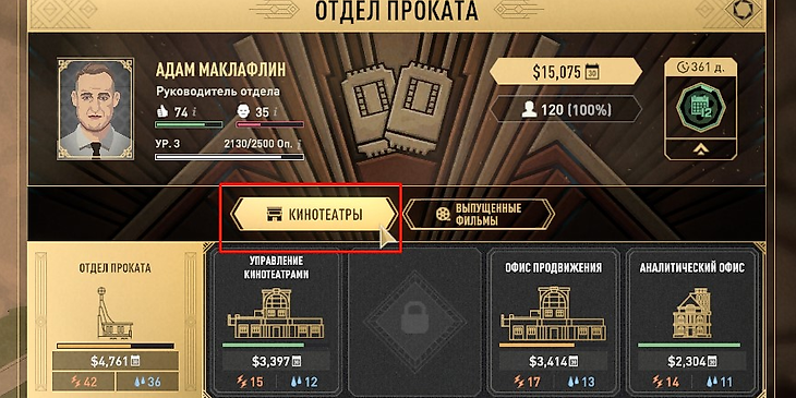 - Построить соответствующее здание и начать закупку кинотеатров. Это позволит организовывать бесплатные показы собственных фильмов и снизить затраты на прокат в чужих кинотеатрах.