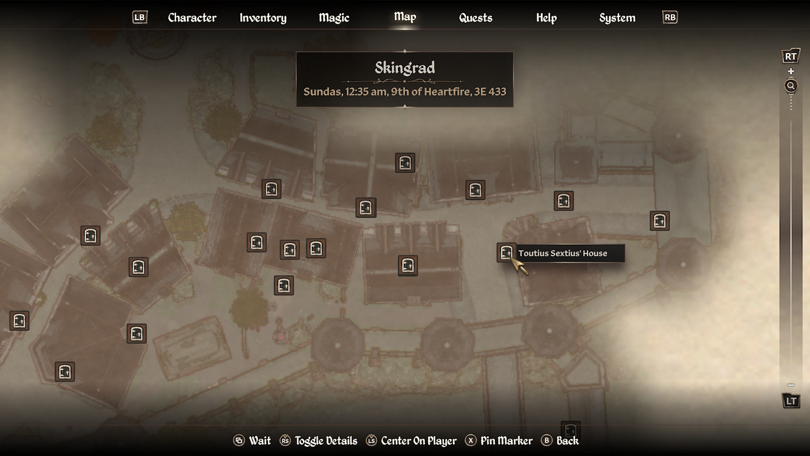 Тутиус просыпается в 6:00 утра и проводит три часа, прогуливаясь по своему дому. Около 9:00 он покидает город и направляется в замок Скинграда, где проводит время в зале графства до 14:00 . После этого он возвращается домой и остается там до конца дня.