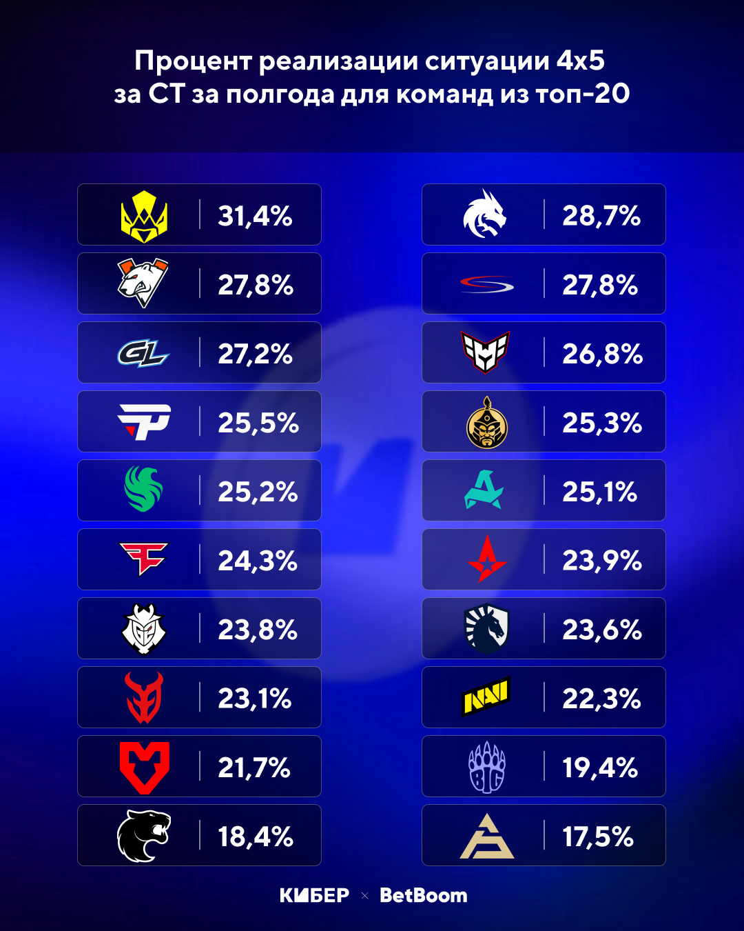 ➢ В топ-10 по игре 4х5 за CT только пять команд из топ-10 рейтинга HLTV.