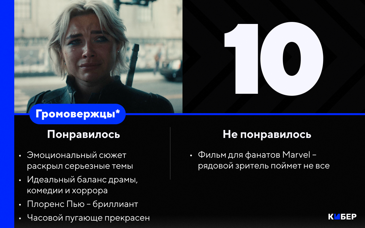 Персонажей поместили в надежную историю – сперва преступники хотят прибить друг друга, затем знакомятся и проникаются уважением. Громовержцы чем-то напоминают Стражей Галактики, но история этой банды мрачнее и драматичнее. Фильм берет не графикой, а эмоциональными дилеммами и человеческими отношениями.