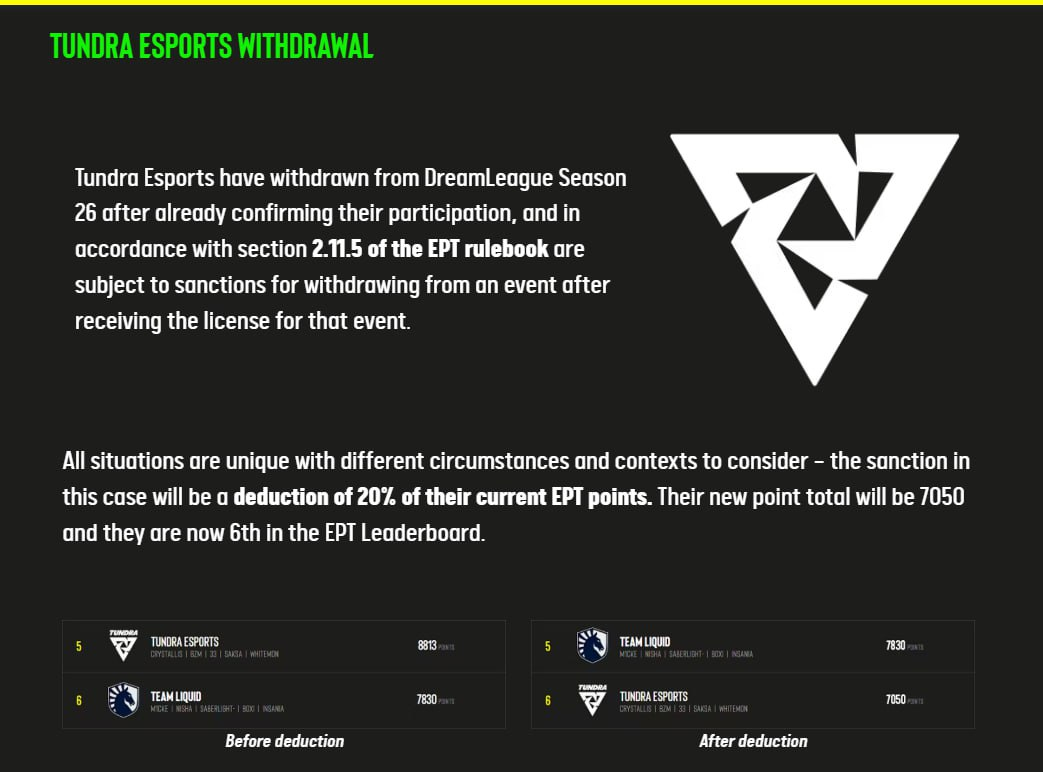 Многие, как и я, сразу же задались вопросом: «А почему Spirit не оштрафовали? Команда тоже добровольно пропустила турнир, но никаких санкций не получила». Но по правилам ESL все четко – Tundra снялась с DreamLeague 26 уже после того, как подтвердила свое участие. Отсюда и штраф в 20% очков.