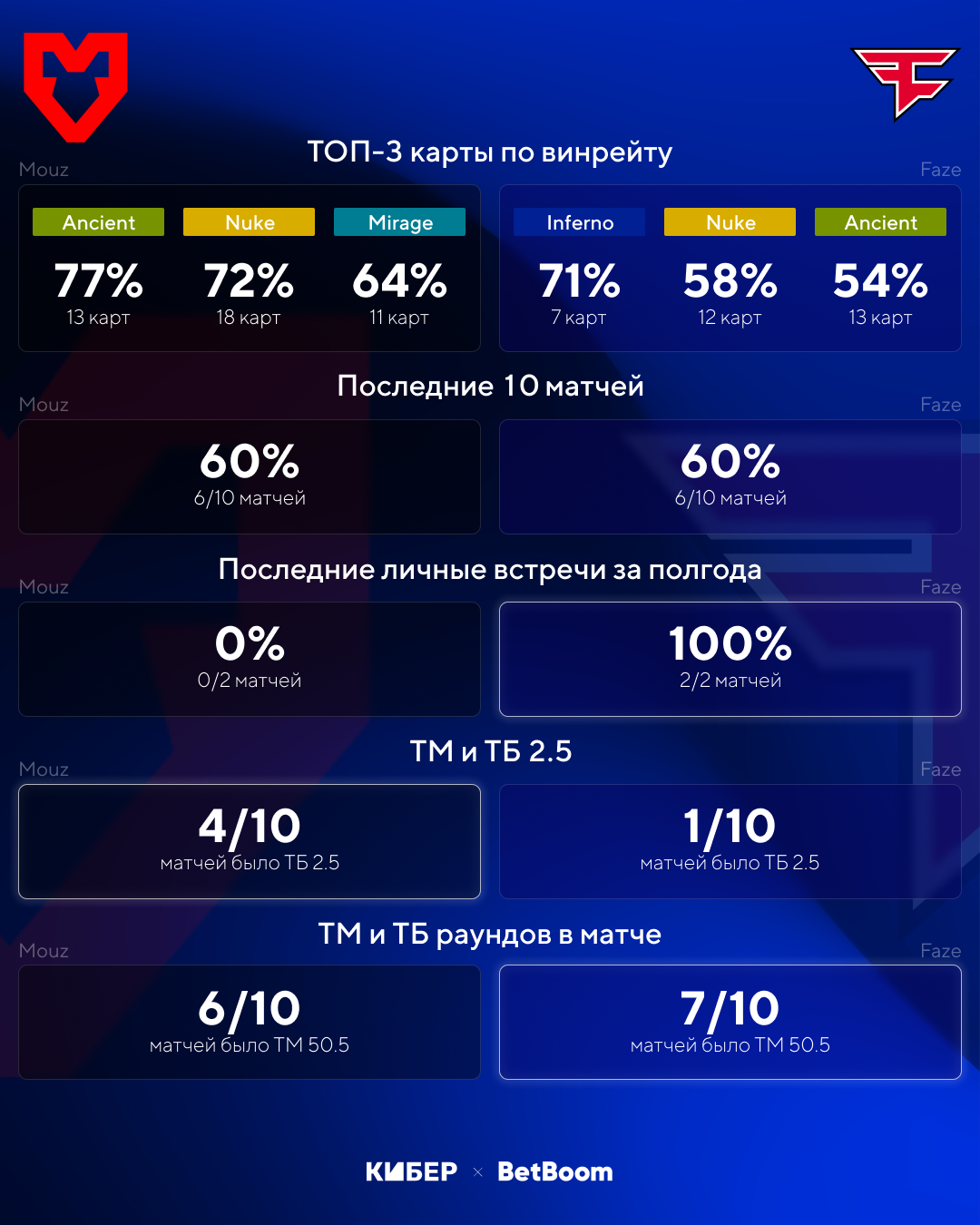 Хотя у Faze есть преимущество по личным встречам, сейчас команды играют на разном уровне: Mouz сражается за титулы и пытается остановить гегемонию Vitality, а Faze только ищет свою игру. Mouz должна уверенно побеждать в матче. BetBoom предлагает коэффициент 2,15 на фору Mouz по картам (-1,5).