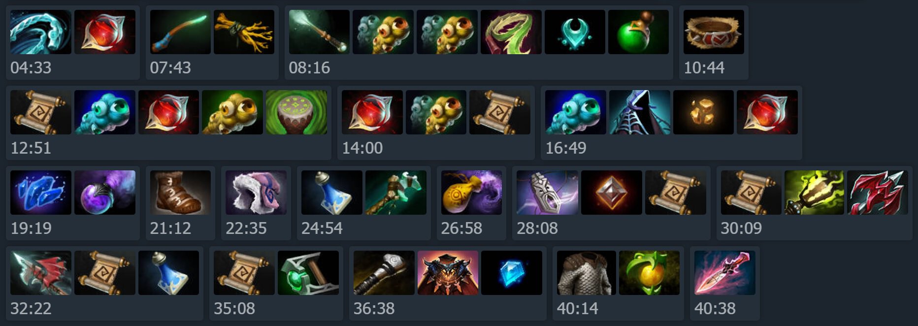 К тому же с раскачкой 1-1-4-1 можно вообще не беспокоиться о мане и даже не покупать Арканы – это вопрос привычки. Кто-то, как например Saksa, регулярно берет Power Treads, чтобы еще сильнее разгоняться по фарму. Кто-то – Транквилы, чтобы в поздней игре собрать из них Boots of Bearing. А на реген маны часто хватает условного Null Talisman.