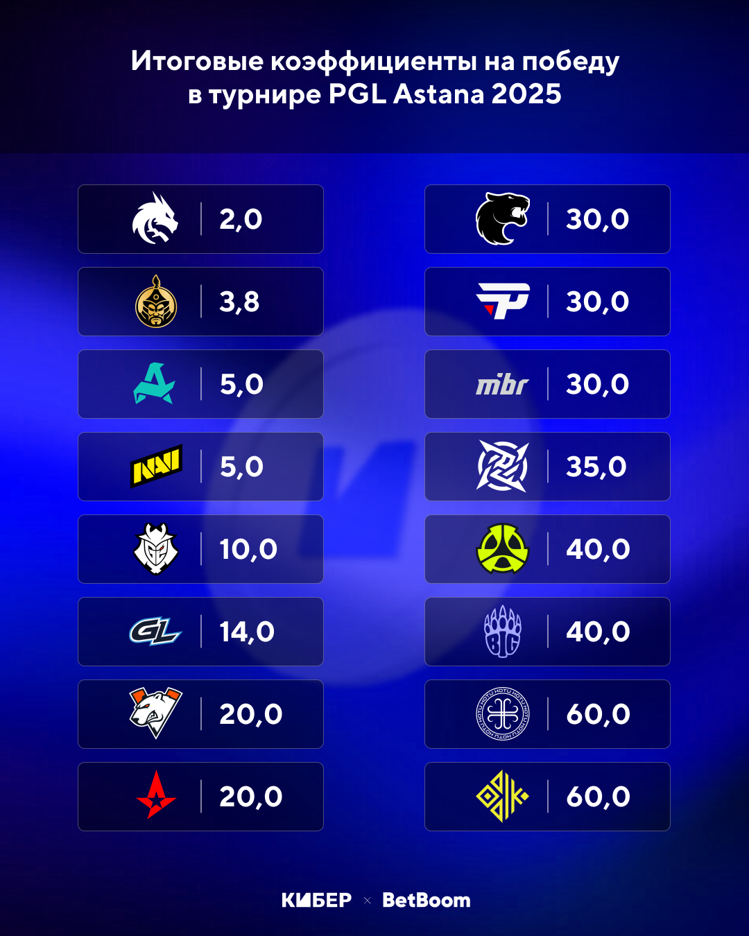 На IEM Melbourne 2025 команда уступила в двух матчах и заняла последнюю строчку, а вот на MESA Nomadic Masters Spring 2025 немцы добрались до второго места. Среди команд, получивших прямой инвайт, BIG имеет самый высокий коэффициент на победу.