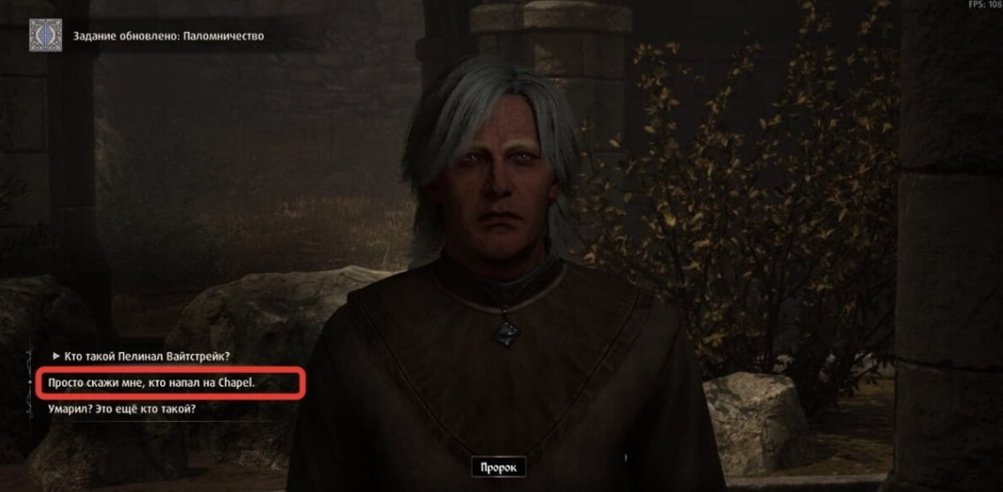 Перед вами появится важный персонаж – Пророк, стоящий возле храма. Обратитесь к нему, задав вопросы о произошедшем. Возможные варианты вопросов: