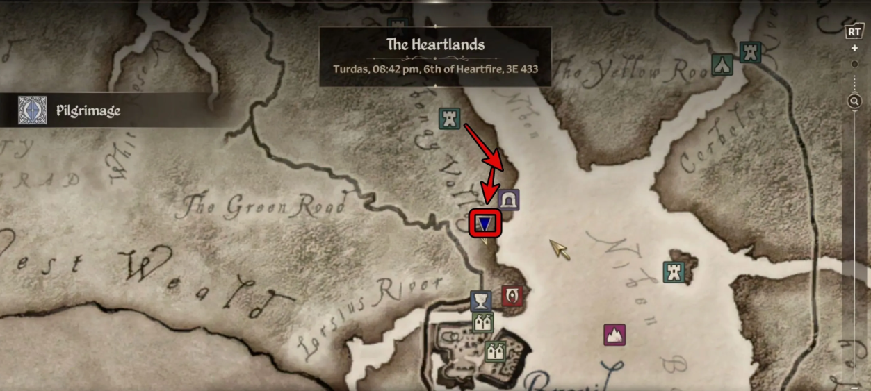 От Имперского города двигайтесь на юг вдоль реки Верхний Нибен. Через некоторое время вы дойдете до форта Алисия, расположенного рядом с мостом. Далее продолжайте движение на юг, и вскоре вы попадете в небольшую долину, где и скрыто святилище.