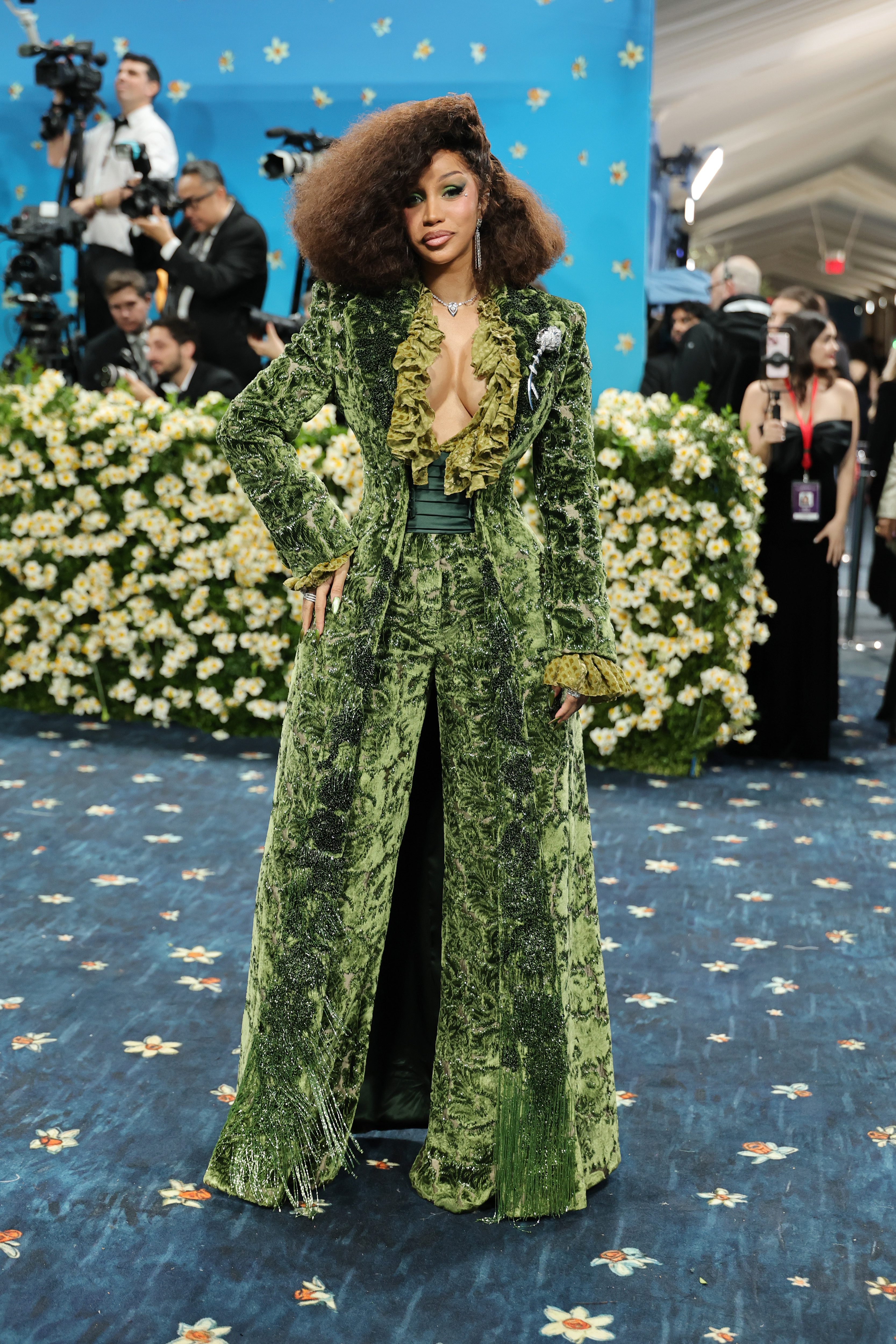 Карди Би проигнорировала дресс-код и поразила эффектным образом. Жакет длиной до пола и брюки из парчовой ткани цвета зеленого мха. Под ним Карди надела зеленую кружевную блузку, которую она расстегнула почти до пупка. Ух!