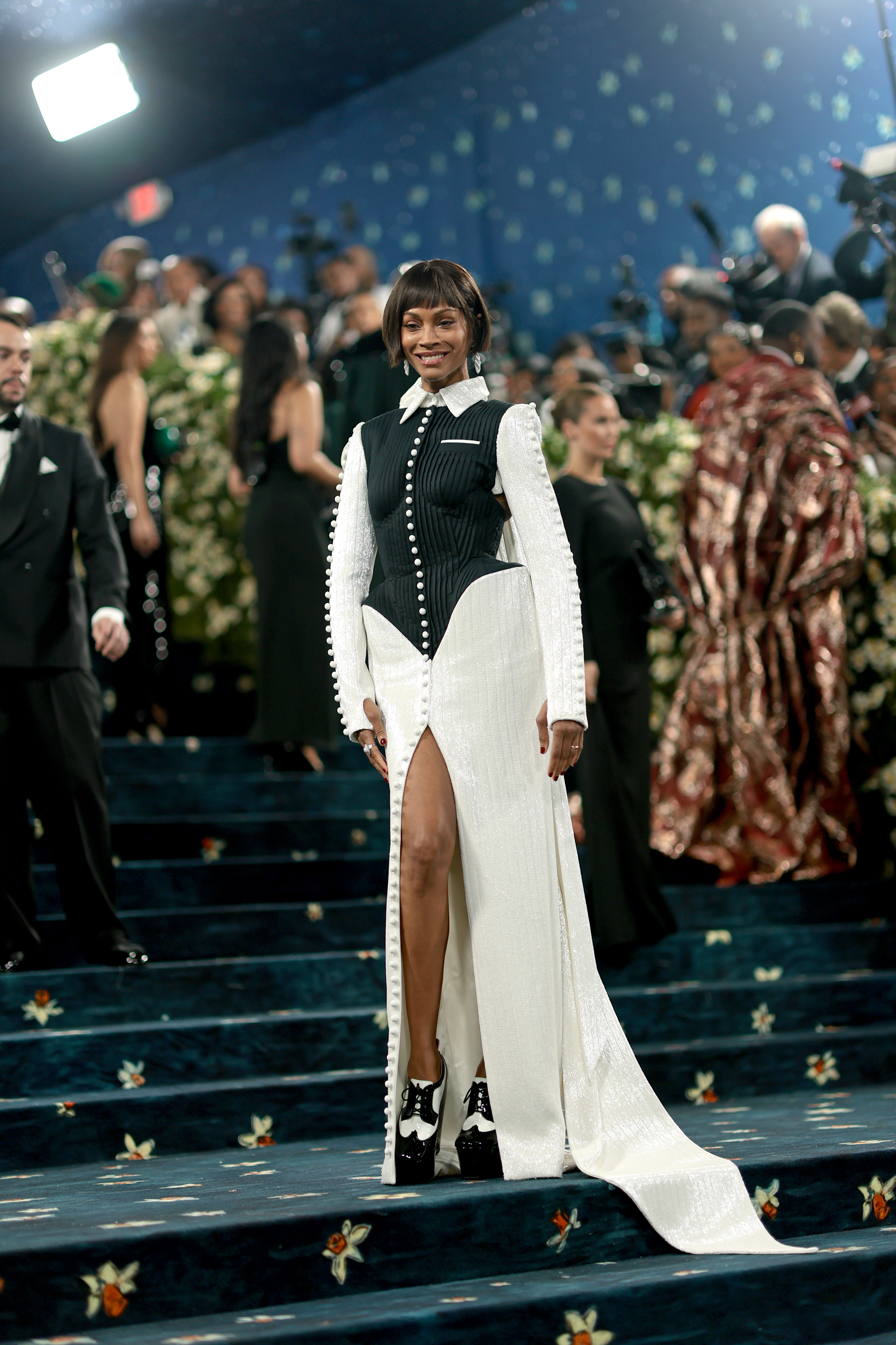Зои Салдана для образа выбрала ретро-стиль: прическу денди-боб в стиле 1920-х и платье Thom Browne с белыми пуговицами.