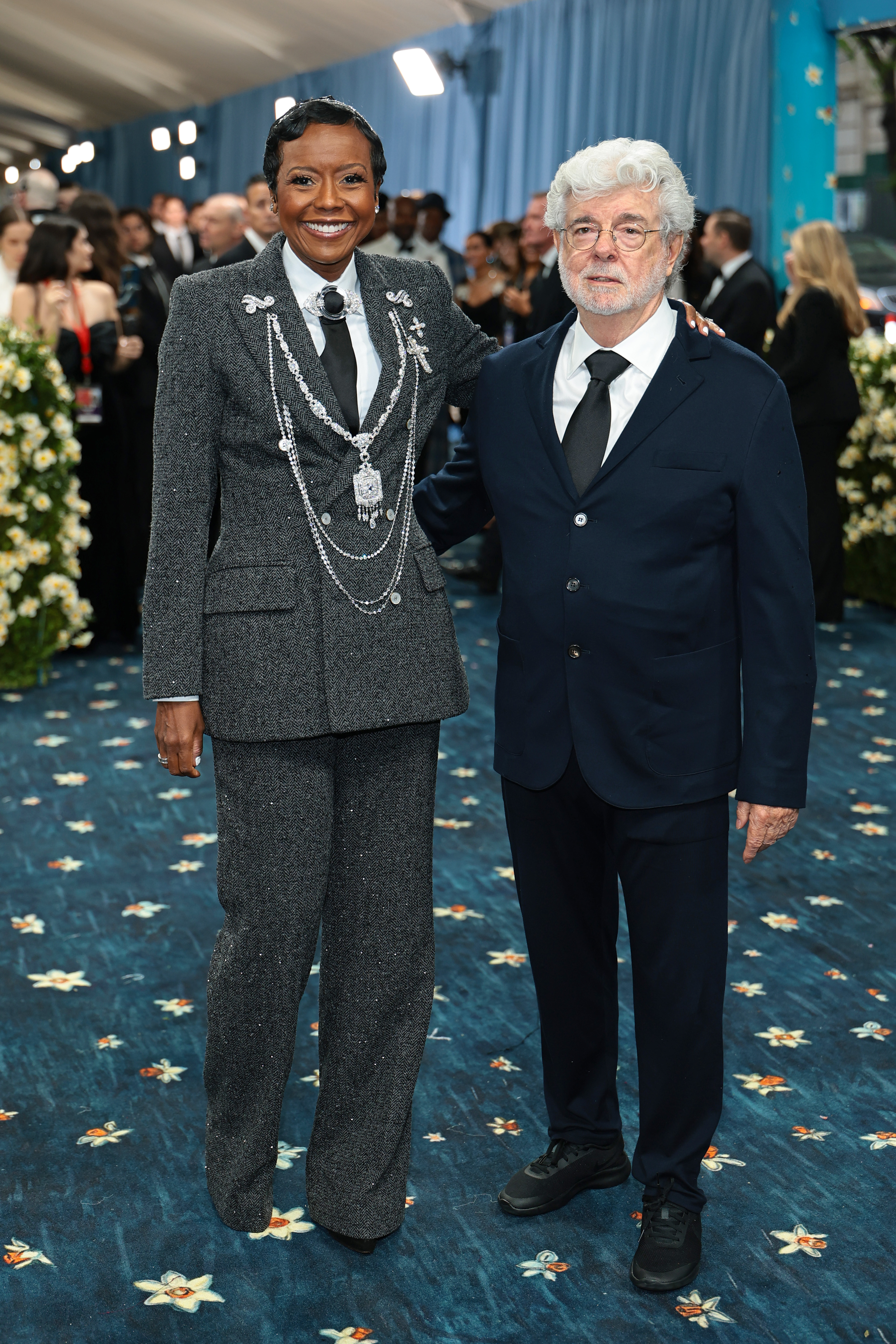 Джордж Лукас пришел вместе с женой Меллоди Лукас. Многих порадовало, что режиссер в качестве обуви выбрал комфортные кроссовки Nike за $60.