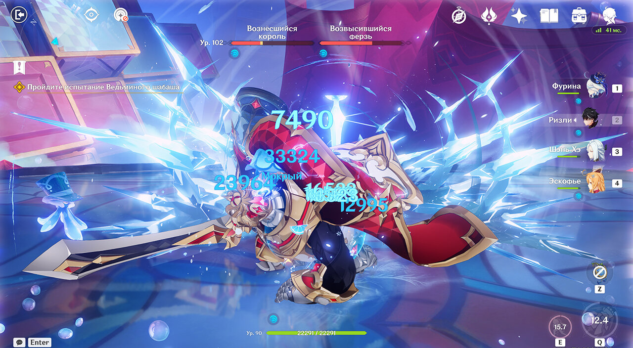 У босса много ограничений: не стоит брать Гидро и Электро персонажей, нельзя брать Пиро персонажей (или можно, если это не основной дпс, и вы не будете атаковать им во второй фазе). Шахматные боссы заточены под Крио с реакцией Заморозка, поэтому стоит взять одну из команд ниже:
