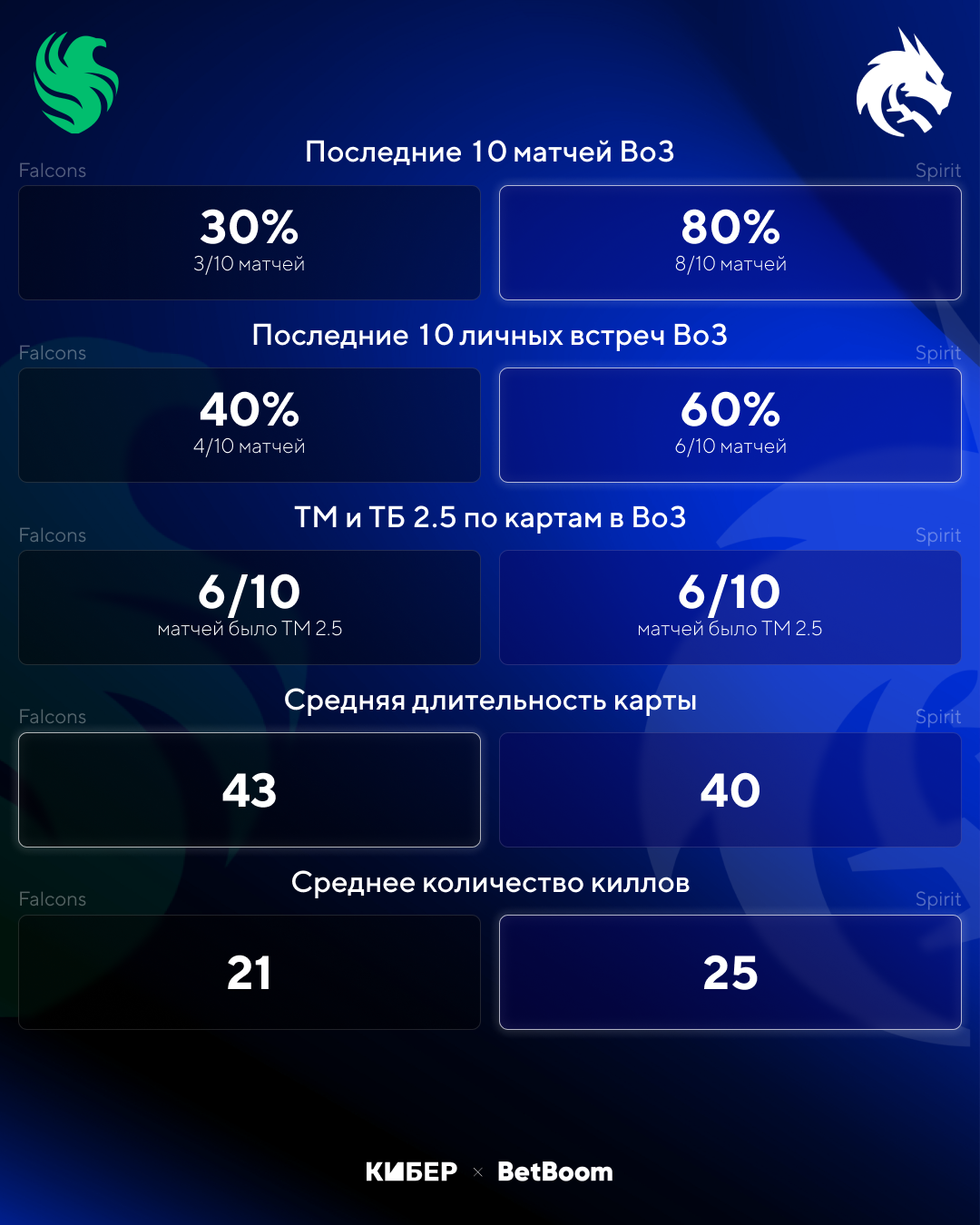 На этом турнире команды играют результативно: только на 2 картах из 12 с участием Spirit соперники не пробили 46 убийств. У Falcons результативными были 3 из 4 карт. В очном матче группового этапа команды совершили 79 убийств на двоих. На второй карте, когда оба состава раскликаются, можно поставить на тотал убийств больше (44,5) с коэффициентом 1,9.