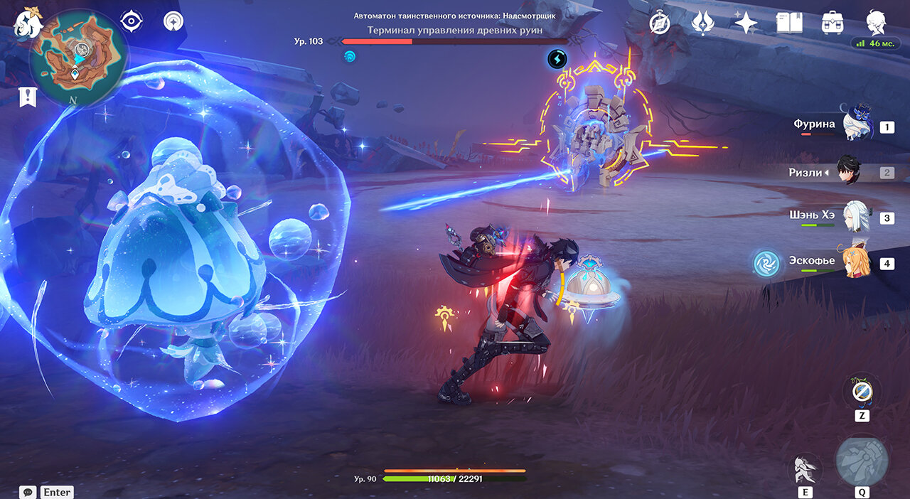 Когда вы снизите здоровье босса, он перейдет во вторую фазу. Надсмотрщик встанет по центру арены и будет выпускать два, а потом и четыре Гидро луча. У него возрастают сопротивления, а также растет урон от атаки с каждым уровнем счетчика. В такие моменты необходимо стоять прямо под ядром и атаковать Крио, чтобы сбить его уровни. Их количество можно отследить под шкалой здоровья.