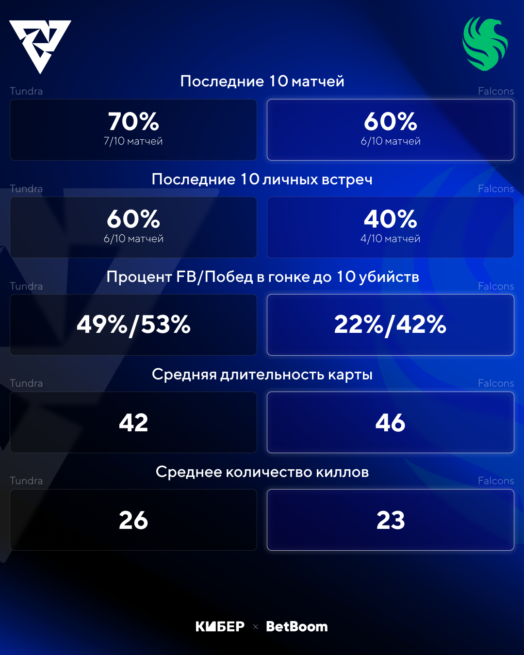 Falcons проливают первую кровь только в 22% матчей за последний месяц. Хоть состав поправил статистику на Blast Slam III, цифры остаются удручающими. Можем поставить на то, что на первой карте First Blood совершит Tundra с коэффициентом 1,85.