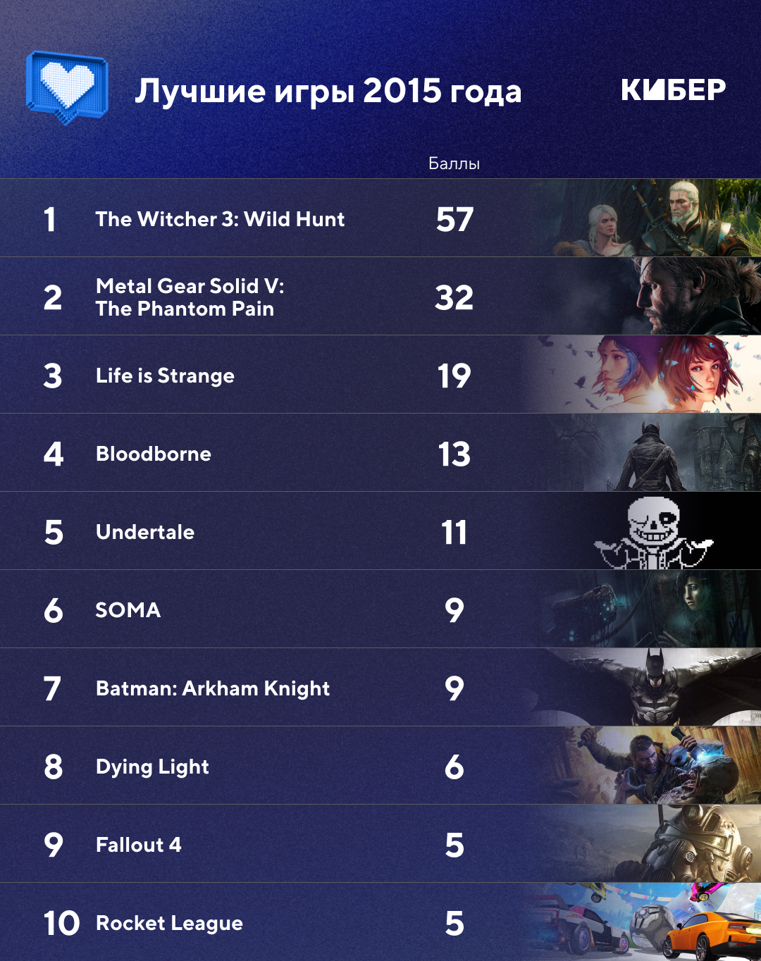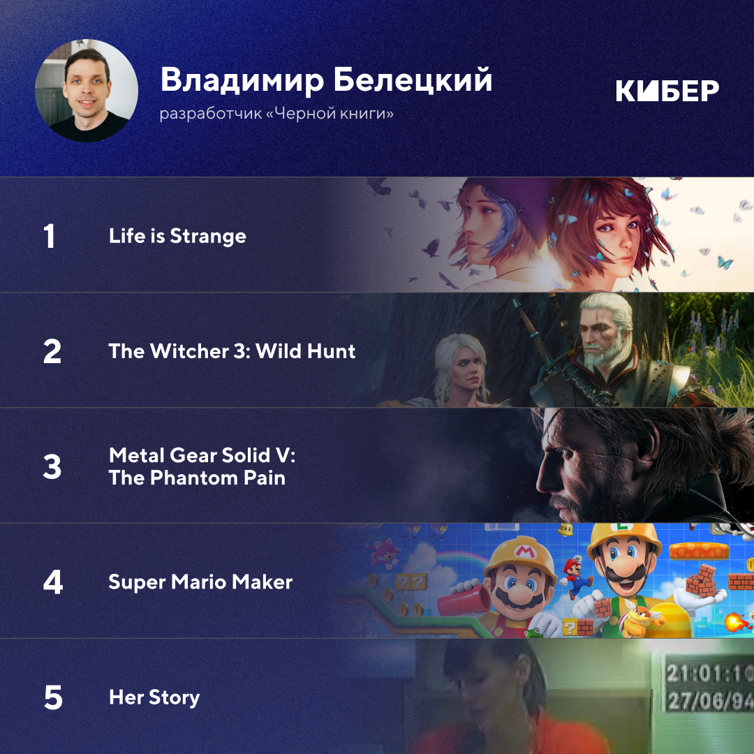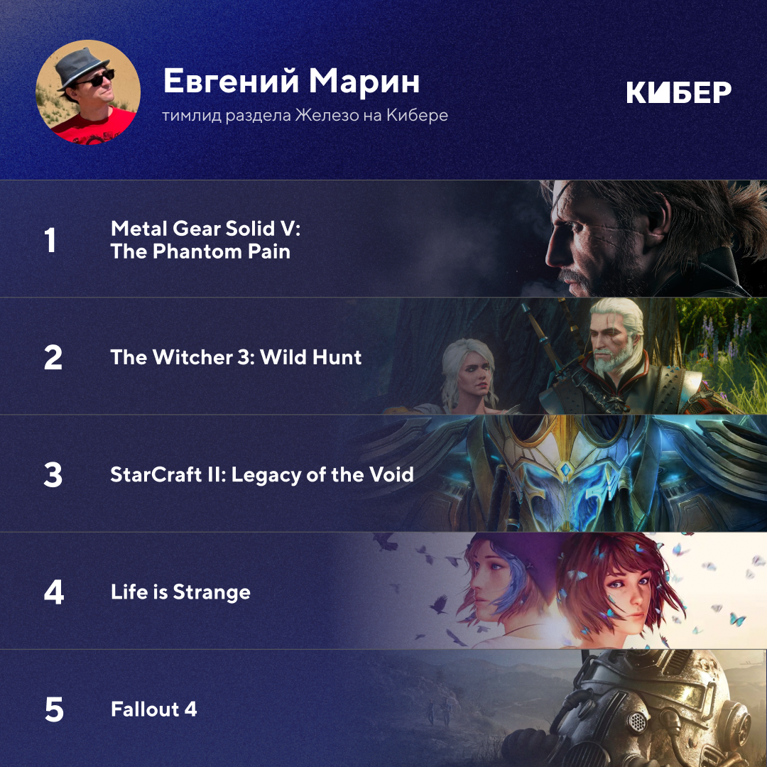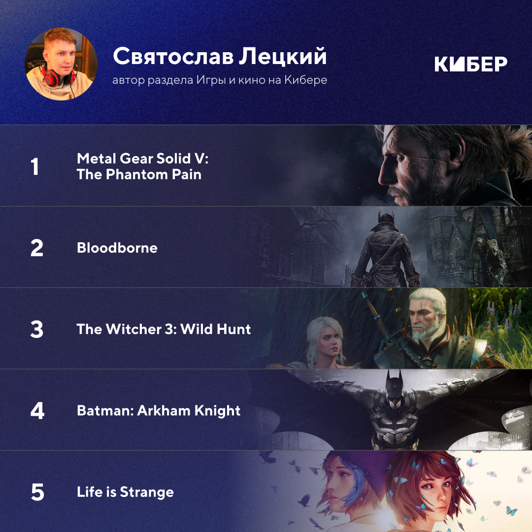 Привет! Я Сева, комьюнити-менеджер Кибера. В марте ко мне в личку пришел chertovsky, блогер Кибера, и предложил собрать ностальгическую подборку: «Спонтанно наткнулся, что 2015-й был насыщенным донельзя – MGS5, «Ведьмак», Fallout, Bloodborne, Life is Strange, Until Dawn, Soma…»