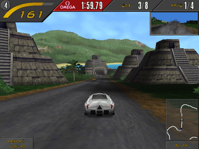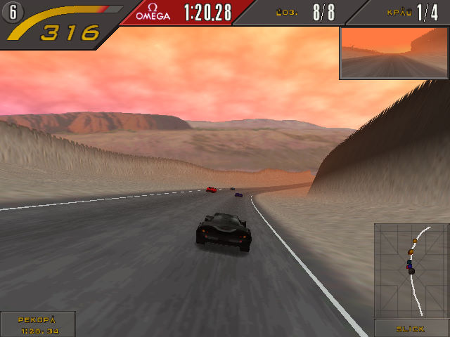 В-четвёртых, улучшили дизайн трасс. Ну как, улучшили... Он стал структурно насыщеннее, дорога перестала быть бобслейным жёлобом, за пределы которого вы не можете выйти, есть точки торможения, которые НУЖНО запоминать, но визуально он очень неровен – некоторые трассы разработчикам удались, некоторые – откровенно нет. Как будто две разные внутренние команды работали. Цветовая гамма здесь приглушенная, полигонов в трассы ввалили порядком (так много, что почти не осталось на улучшение моделей машин или прикручивание к ним модели повреждений), но даже улучшенный движок картинку в целом не вытягивает. И это ещё ПК-версия SE с поддержкой 3Dfx смотрится среднепаршиво, на PS1 стандартная версия выглядит ещё хуже.