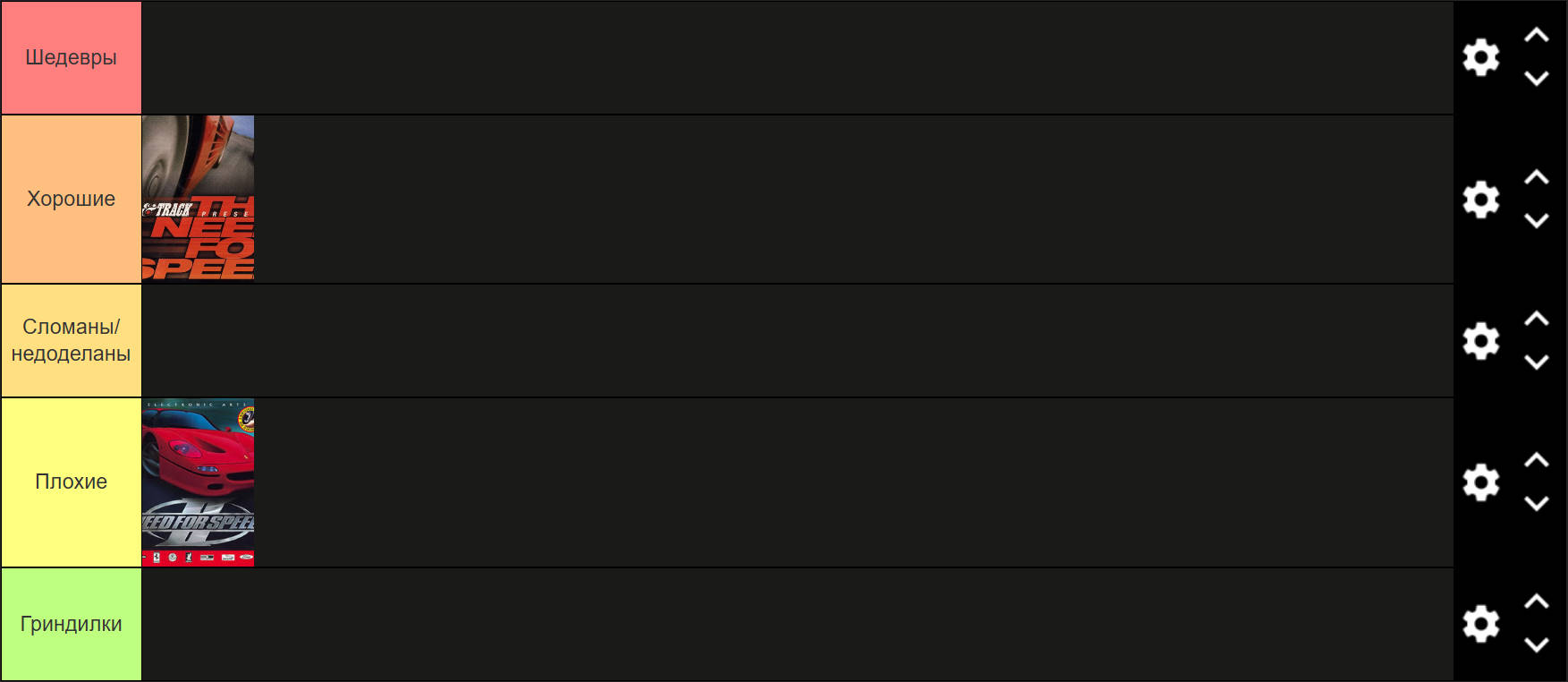 Ну и в конце, маленькое объявление. Вы же любите всякие тир-листы, да? Так вот, после каждой рецензии на очередной Need for Speed, я буду распределять игры этой серии по тир-листу. Выглядеть он будет вот так: