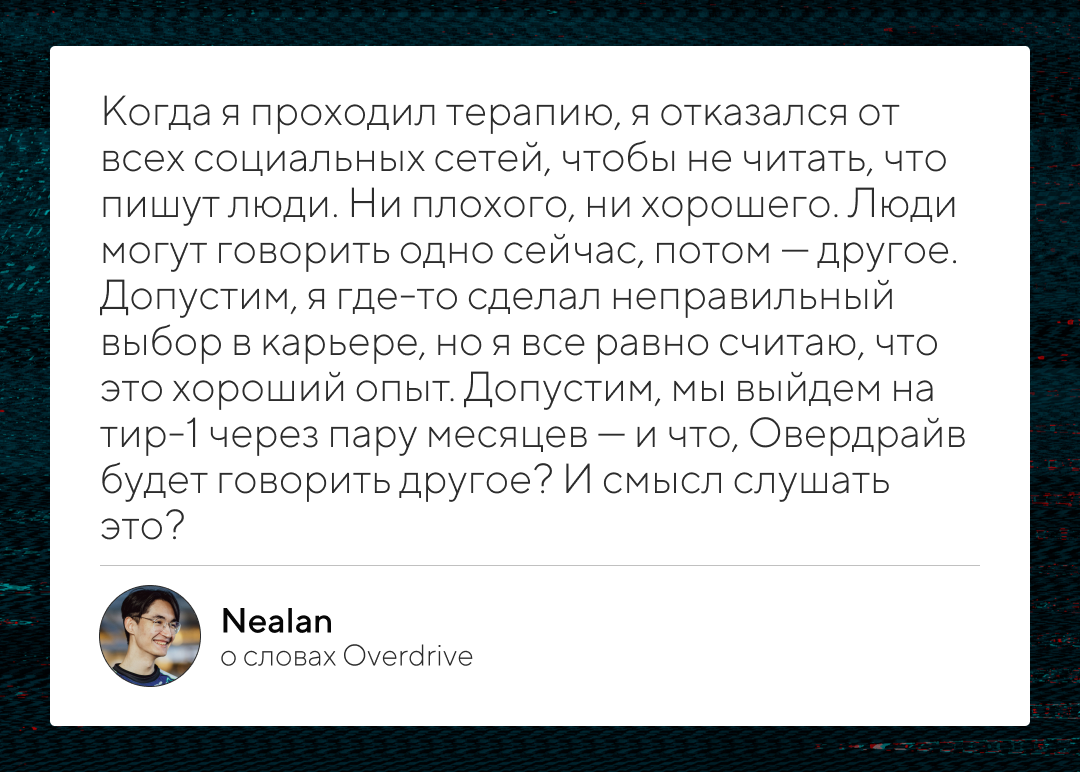 – Ну ладно. Я ничего не думаю, если честно. Когда я проходил всю эту терапию, я отказался от всех социальных сетей — отписался от новостных порталов, чтобы не читать, что пишут люди. Ни плохого, ни хорошего. Люди могут говорить одно сейчас, потом — другое. Допустим, я где-то сделал неправильный выбор в карьере, возможно, пошло что-то не так. Но я все равно считаю, что полученный опыт был хороший. Допустим, мы выйдем на тир-1 через пару месяцев — и что, Овердрайв будет говорить другое? И смысл слушать это?