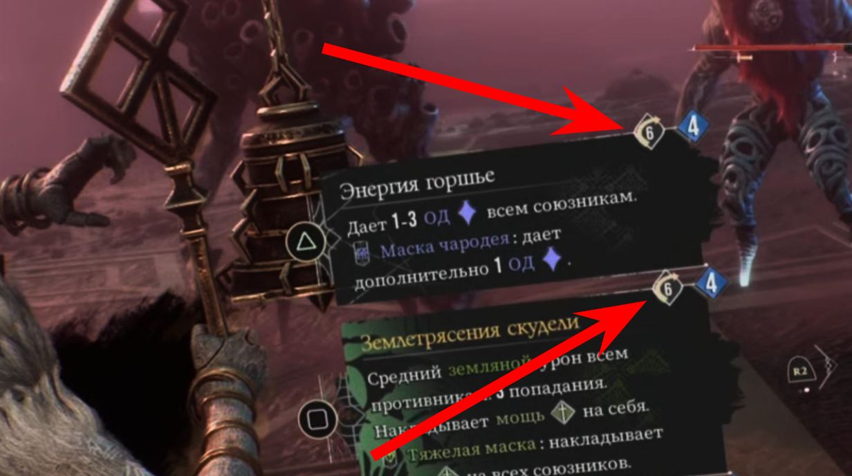 Описание: дает 1-3 ОД (зависит от выполнения QTE) всем союзникам. Маска чародея: дает дополнительно 1 ОД.