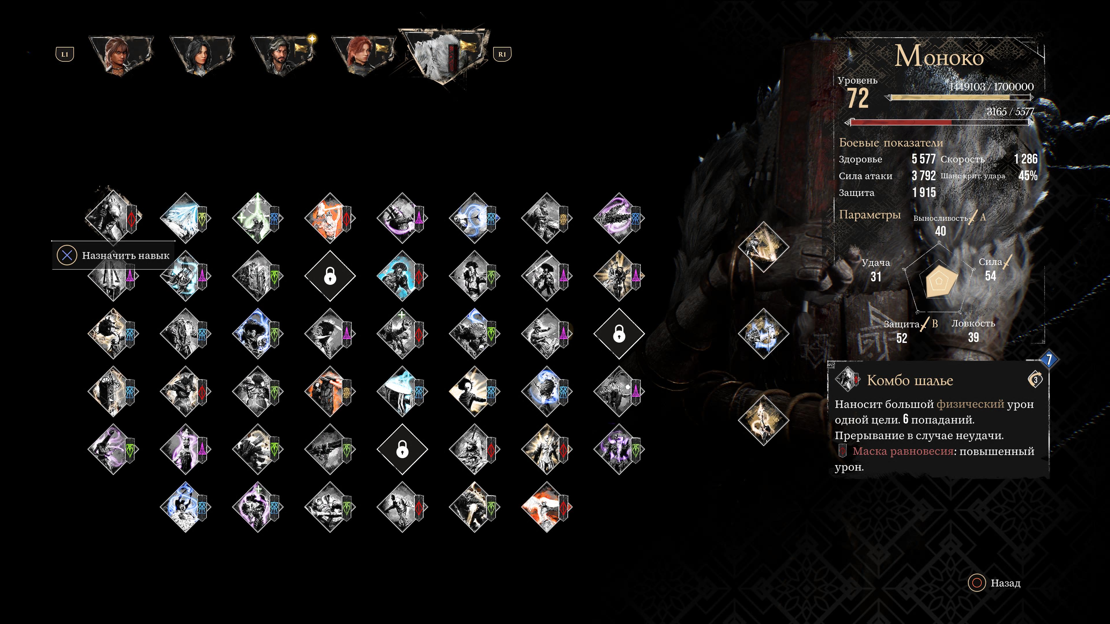 Моноко как персонаж поддержки. В таком случае вкладывайте очки параметров в выносливость и защиту для повышения выживаемости персонажа. Так же важна ловкость, поскольку Моноко критически важно как можно чаще ходить и быстрее добираться до нужных масок.