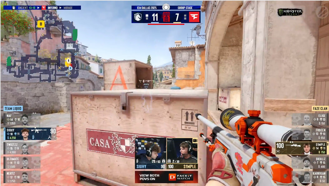 Вот Faze играет с Liquid. Cимпл в клатче с AWP на Inferno прячется за ящиком на точке А. Клатч он выиграл.