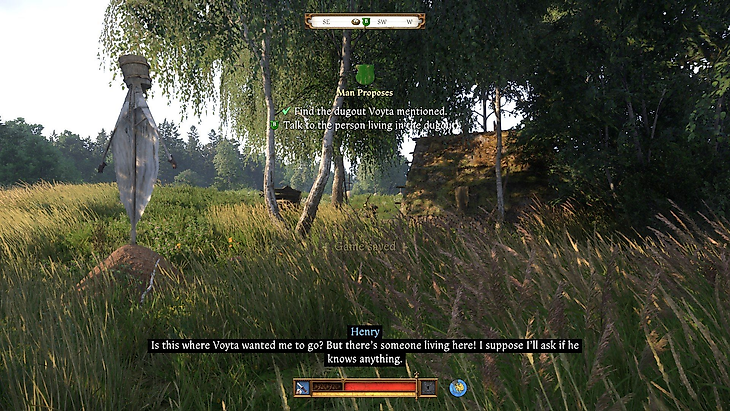После разговора отметка на карте укажет ориентир рядом с деревней Межолезы. Проще всего добраться до места, если воспользоваться точкой быстрого перемещения в Мышковицах, а дальше добраться верхом (ну или пешком, если вы в настроении прогуляться). Землянка находится к юго-востоку от Межолезов, в лесистой местности. Возле входа сидит подозрительный человек – он и станет вашим «гидом» по этому странному месту.