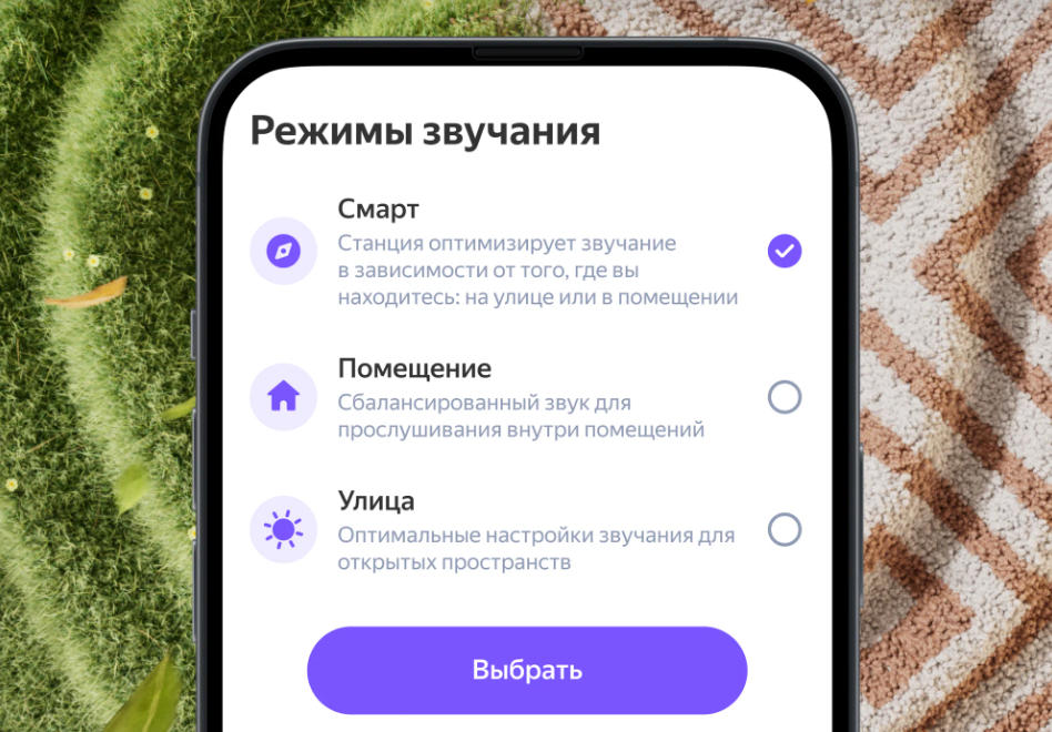 - Смарт – колонка определяет местоположение (улица/помещение) и настраивает звук. В помещении делается акцент на бас и детализацию, а на улице усиливаются средние частоты для лучшей разборчивости.
