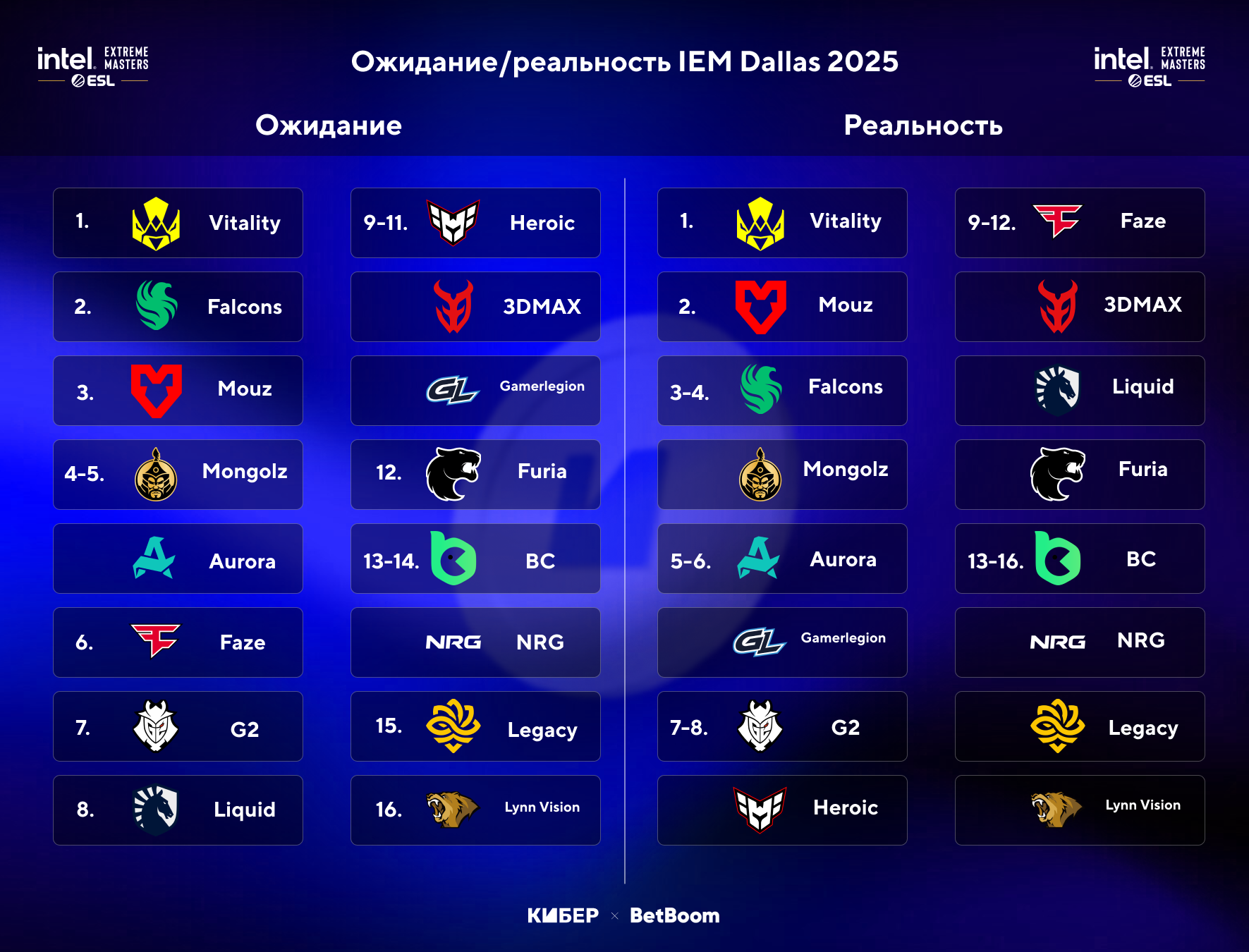IEM Dallas прошел без шокирующих результатов: Vitality буднично выиграла очередной чемпионат. BetBoom ожидала увидеть в финале Falcons, но они оступились в матче с Mouz и попали в сетку к Vitality.