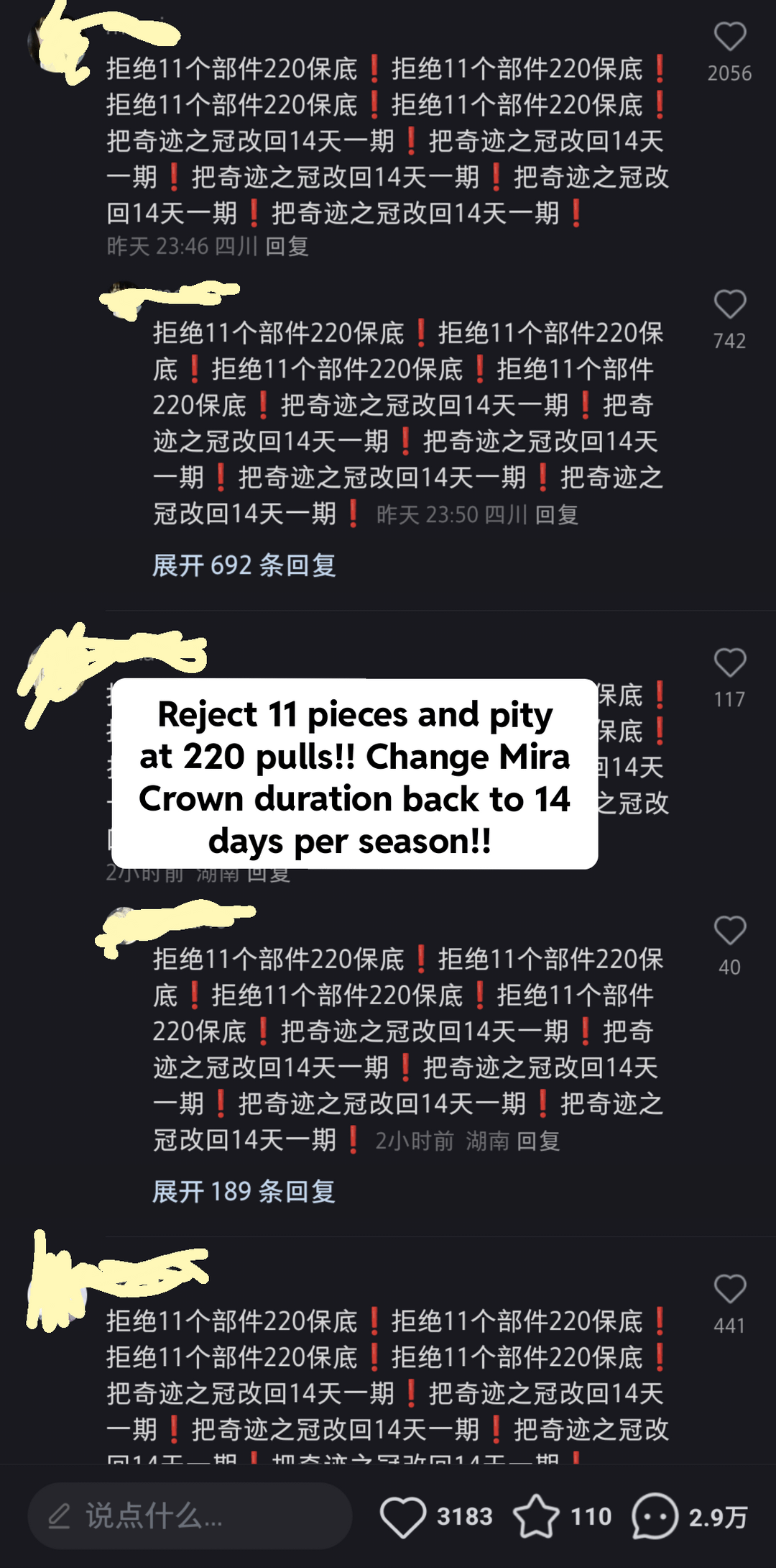 «Откажитесь от 11 деталей по фиксированной цене 220. Верните Mira Crown к 14-дневному периоду!» – говорится в обращении.