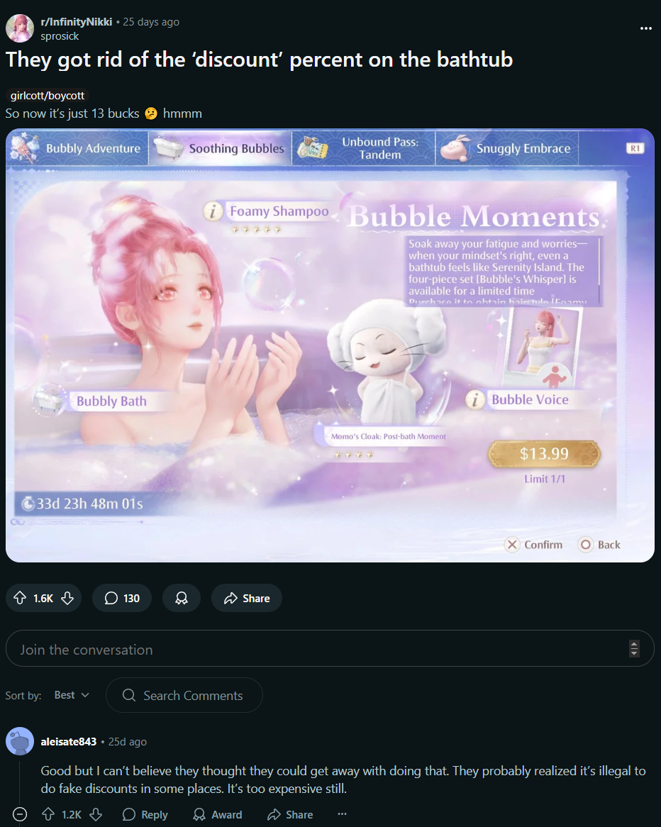 Но не только F2P-игроки жалуются на Infinity Nikki. Донатеров политика проекта аналогично не устраивает, ведь в последнее время во внутриигровом магазине появились предметы с искусственно завышенной стоимостью для создания иллюзии скидок. Игроки быстро обнаружили обман, когда увидели декоративную ванну за 10 долларов, которая якобы продавалась со скидкой 80%. Фактически Infold и не собирались завышать цену. В некоторых странах такие маркетинговые уловки считаются незаконными.