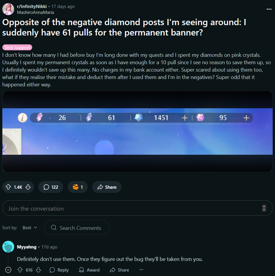 «В противоположность негативным постам про алмазы: у меня внезапно появилась 61 крутка на постоянный баннер? Я не знаю, сколько у меня было до этого, но все квесты я давно завершила, а алмазы потратила на розовые кристаллы. Обычно я сразу трачу постоянные кристаллы, как только набирается на 10 круток – не вижу смысла копить. Так что я точно не могла накопить столько сама. В выписке по карте никаких списаний тоже нет. Теперь даже страшно их использовать – а вдруг разработчики заметят ошибку, заберут крутки после того, как я их потрачу, и я уйду в минус? В любом случае, очень странная ситуация», – MashiroAnnaMaria.