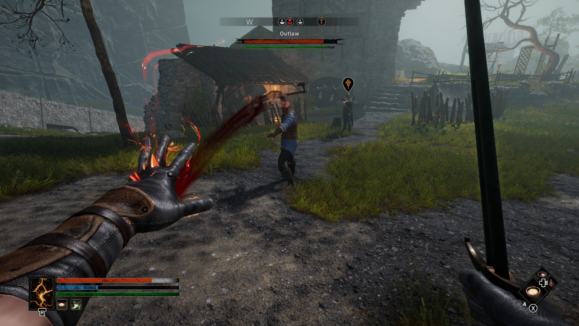 Ваша задача – оперативно прокачаться и дорасти до качественной экипировки. Опыт дают за убийство врагов и развитие навыков вроде готовки и владения одноручным оружием. Но больше всего экспы отсыпают за выполнение квестов, в том числе быстрых. К примеру, женщина в деревне тоскует по мужу, захваченному бандитами. Сбегайте в логово, освободите беднягу и получите достаточно опыта, чтобы усилить героя.