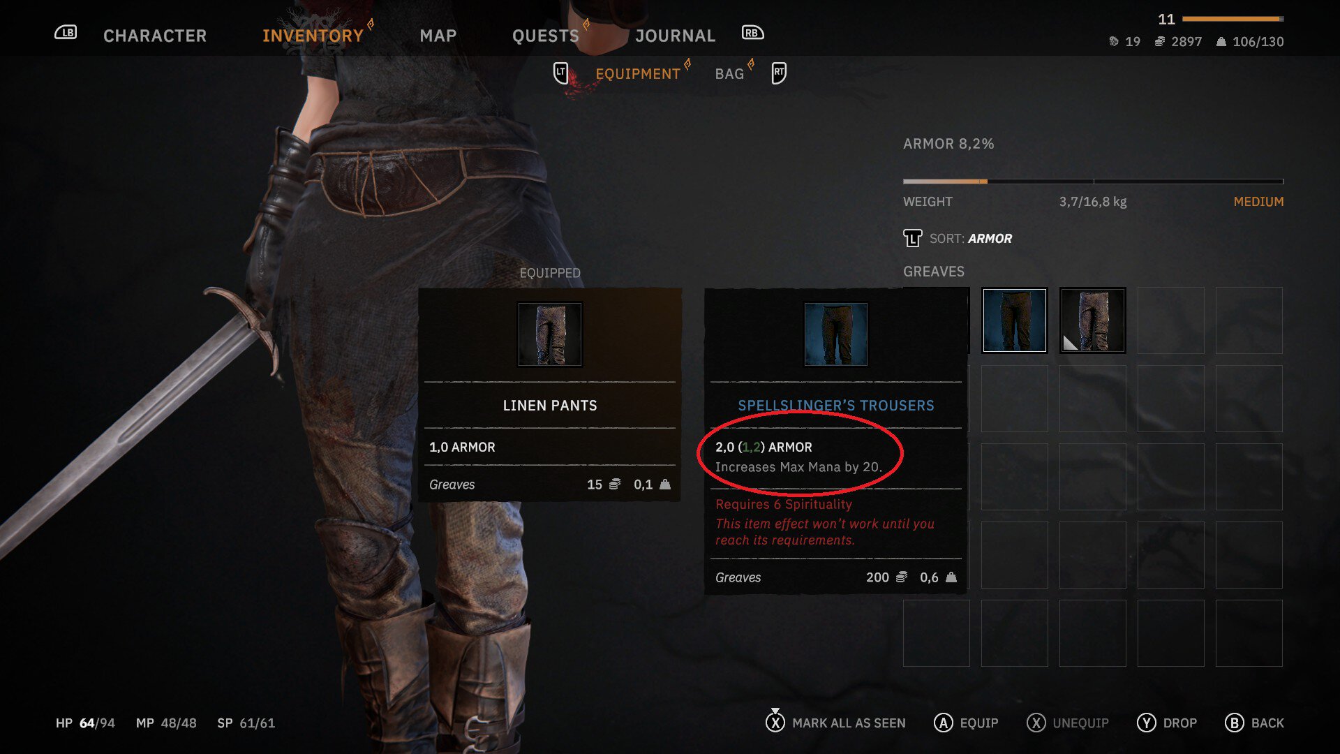 У каждого предмета есть базовые параметры. Например, у штанов со скриншота две единицы брони. Вот только у моего героя недостаточно развита мистика, поэтому прямо сейчас штаны дадут только 1,2 единицы защиты. Свойство по увеличению маны тоже не сработает, пока не прокачаюсь. Зато любой клинок нанесет повышенный урон, если требует силы, а герой необычайно мускулист.