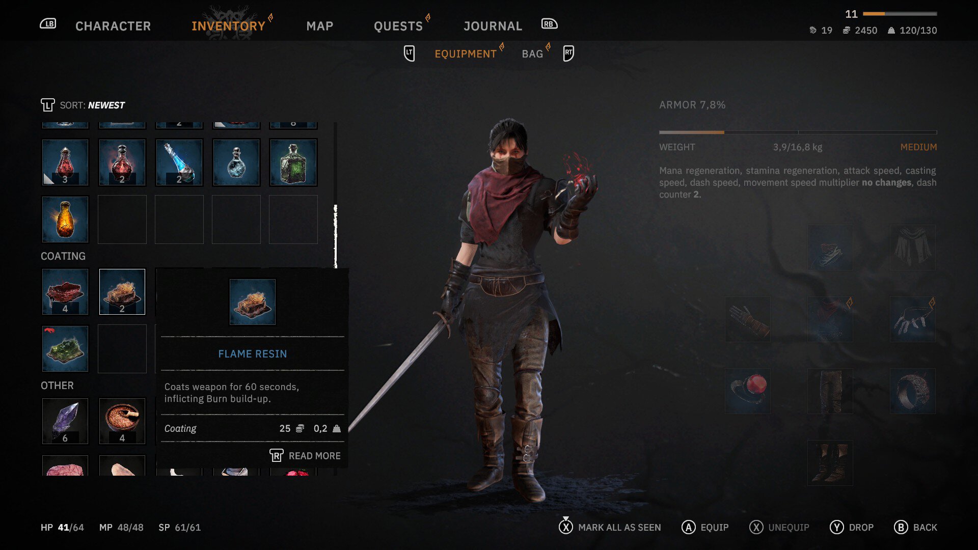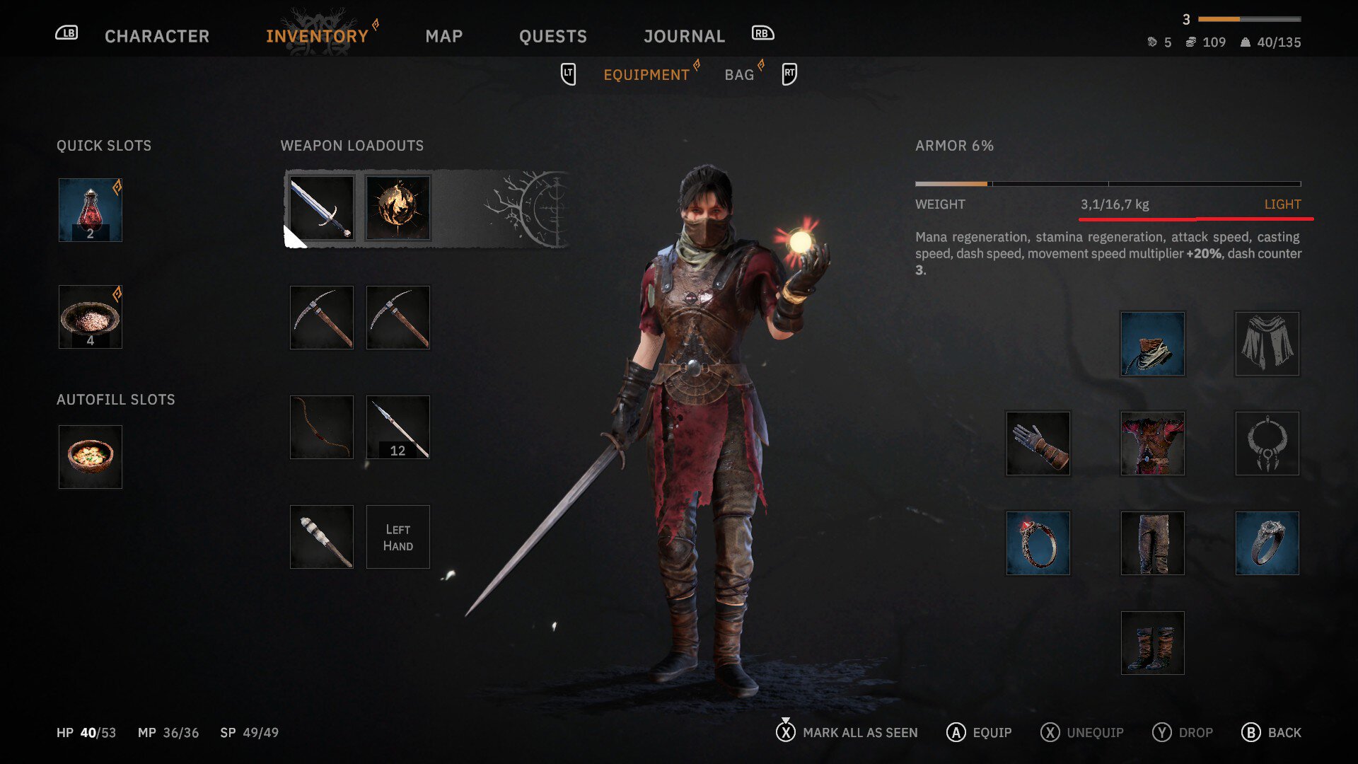 Показатели билда можно посмотреть в инвентаре. В верхнем правом углу обозначена тяжесть экипировки и текущие бонусы.