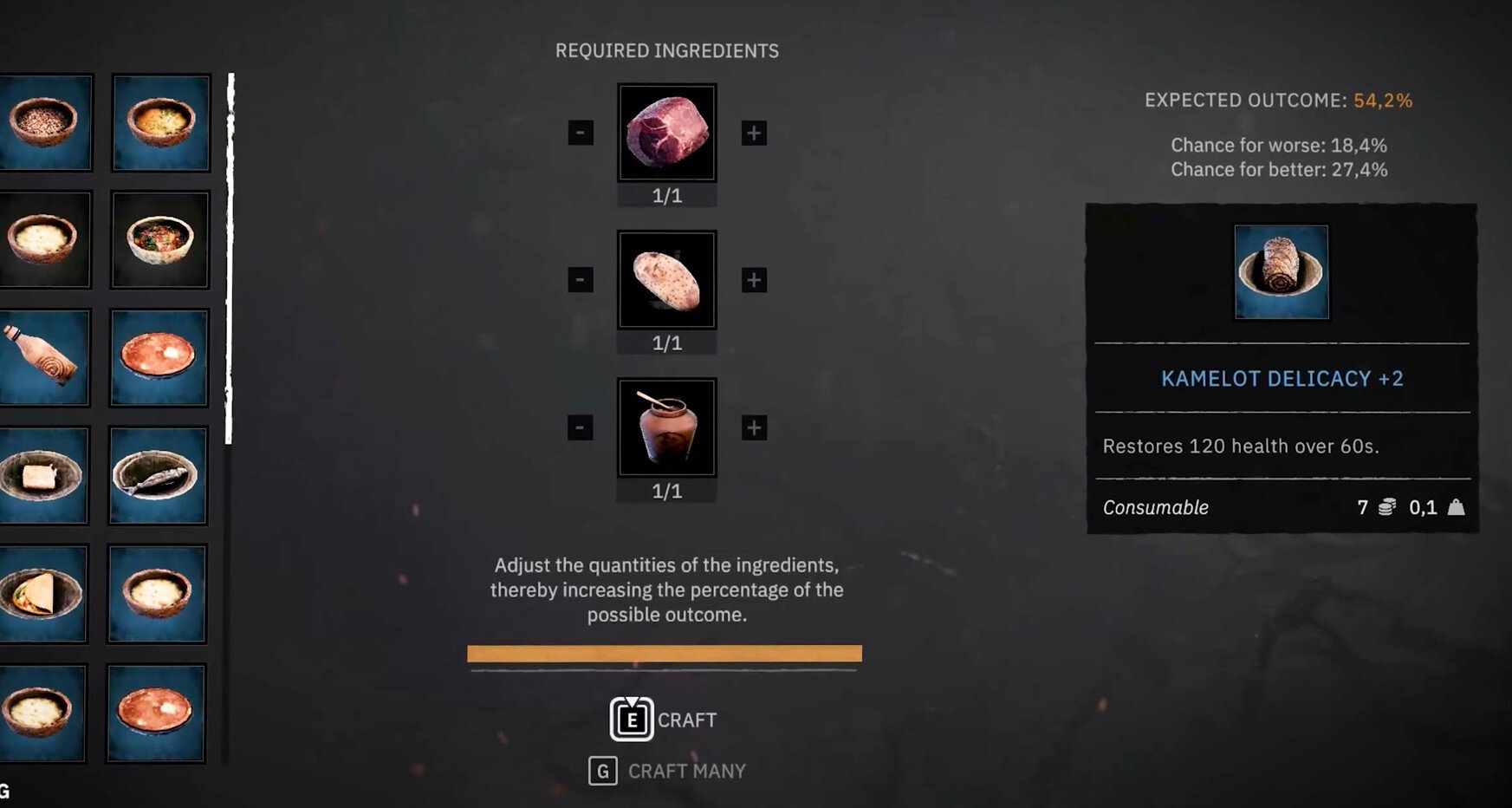 Проблема в том, что рецепты изначально неизвестны. Нужно либо искать их, либо экспериментировать. Допустим, если смешаете оленину, хлеб и мед, получите изысканный деликатес, который 120 секунд восстанавливает здоровье.