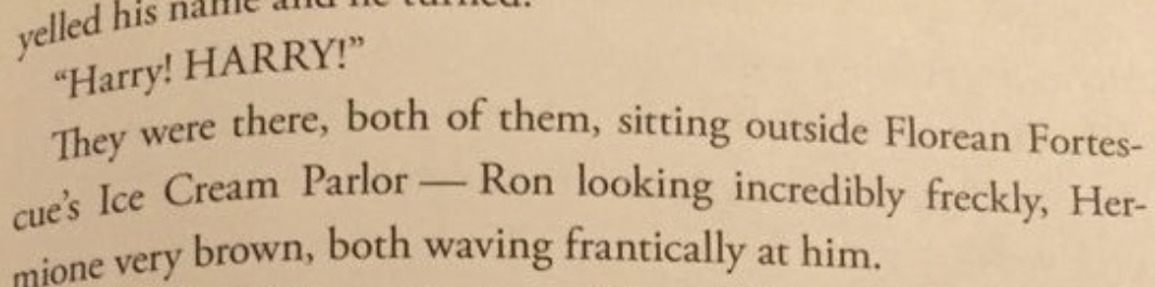 О цвете кожи Гермионы в книгах говорится только один раз в четвертой главе «Узника Азкабана»: «Гарри обернулся. Вот они! Вдвоем сидят в кафе-мороженом Флориана Фортескью! Рон еще больше усыпан веснушками, Гермиона очень загорела, оба что есть силы машут ему».