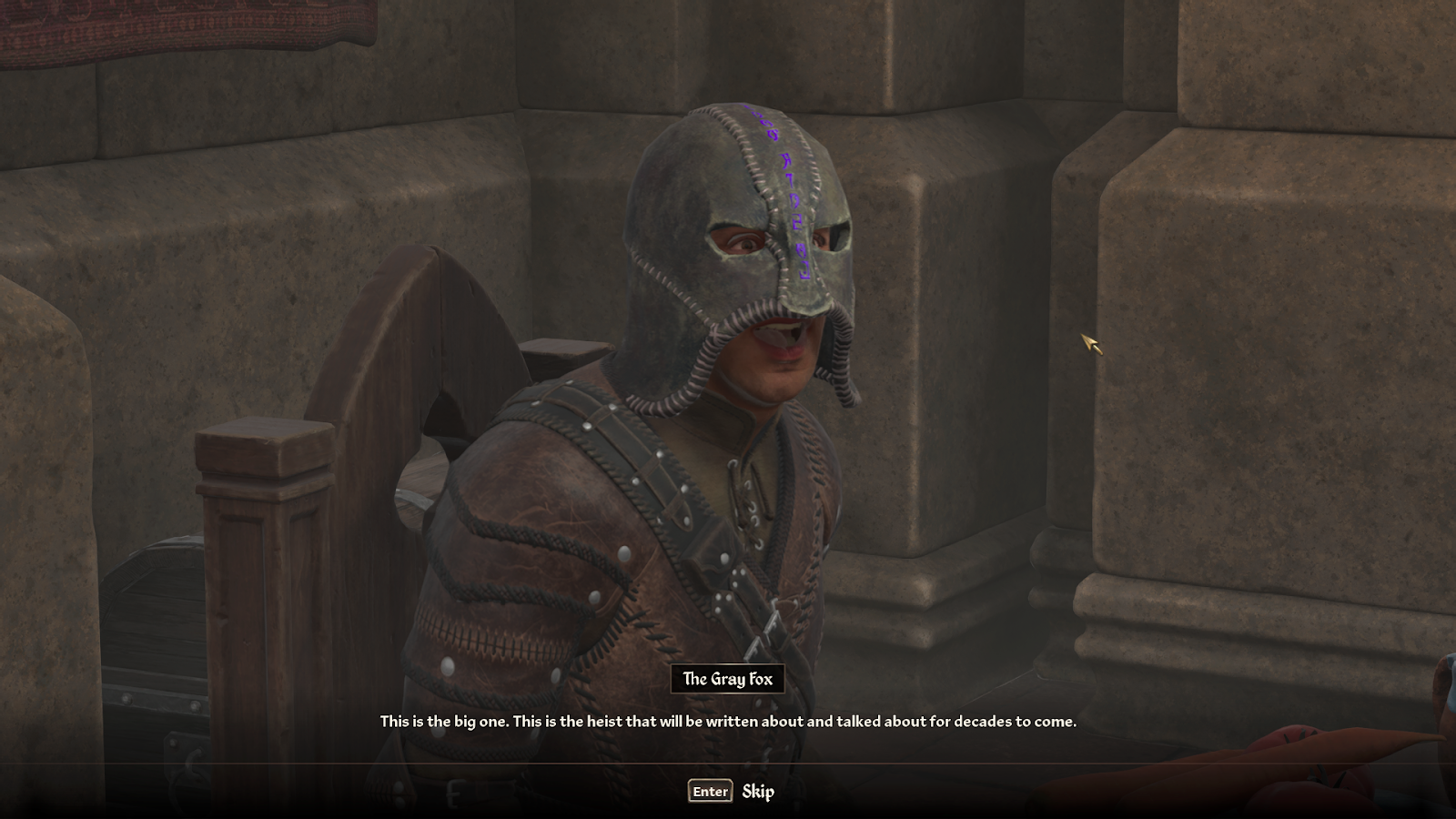 После выполнения всех предварительных условий и получения необходимых артефактов, Амузай передаст вам сообщение от Серого Лиса с указанием места встречи – дом Отрелоса в районе Эльфийских садов Имперского города. Там Серый Лис подробно изложит план ограбления, предоставит письменные инструкции и вернет вам ранее добытые артефакты. Он также предупредит о сложности предстоящей задачи и необходимости тщательной подготовки.