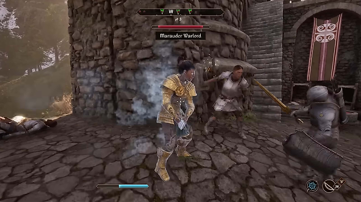 Быстрее всего добраться можно через фаст-тревел к Корролу, а оттуда – пешком на запад. На подходе услышите лязг оружия: у ворот сражаются 4 мародера и последний выживший стражник. Вам предстоит разобраться с мародерами, однако даже на низких уровнях с этим у игроков не возникнет проблем. Рекомендуется не бежать сломя голову, а сначала расстрелять их из лука, а уже потом добить чем-нибудь тяжелым. Можете воспользоваться хитростью: заманите противников под опускную решетку ворот, а затем активируйте рычаг справа от входа. Так вы оглушите всех мародеров, а затем остается их только добить.