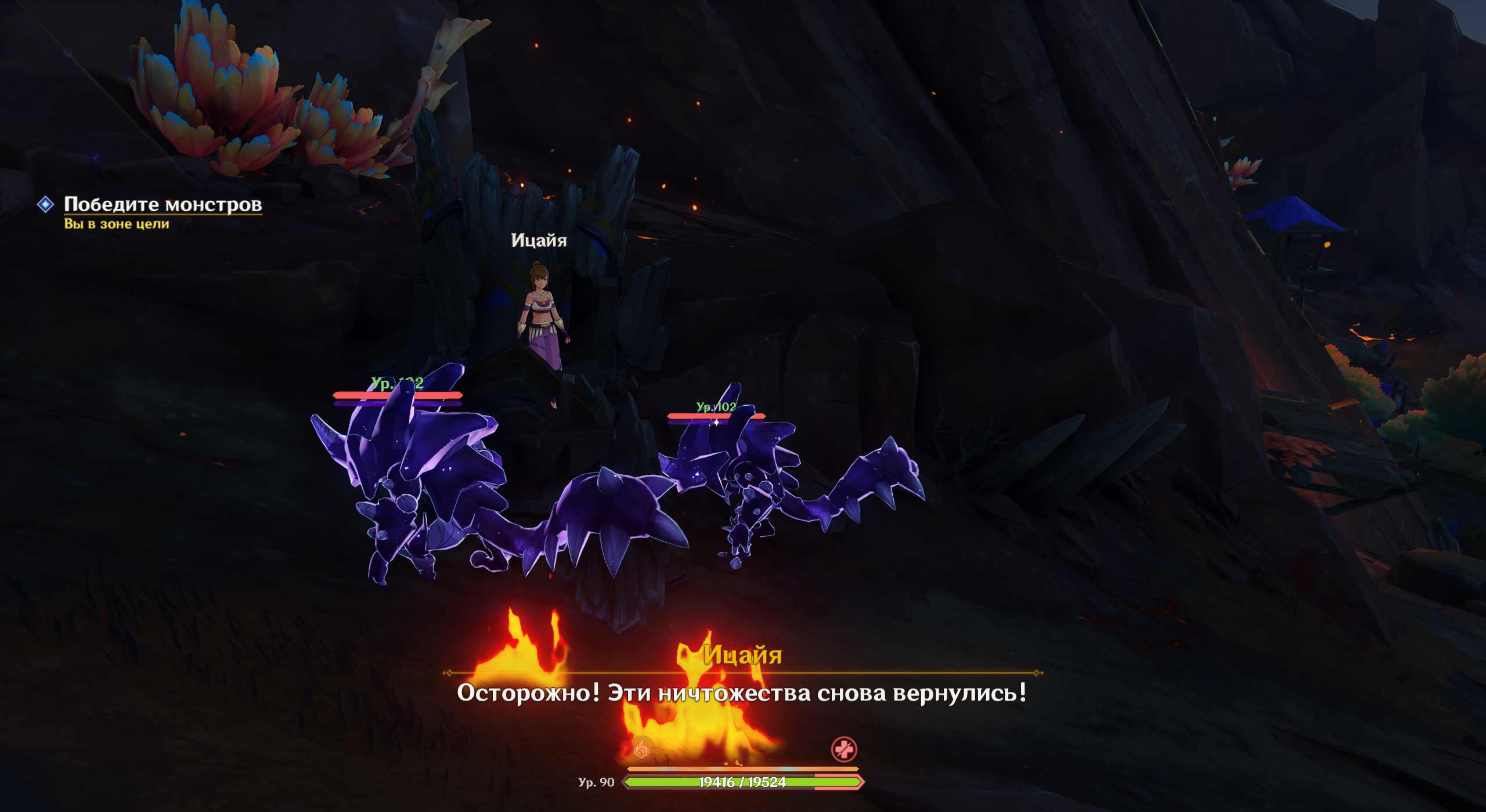 Более быстрый вариант. Если вы сначала найдете Ицайю, окруженную врагами, квест сразу начнется с боя. Вам предстоит сразиться с сумрачными мимифлорами, замаскированными под детенышей геовишапов.