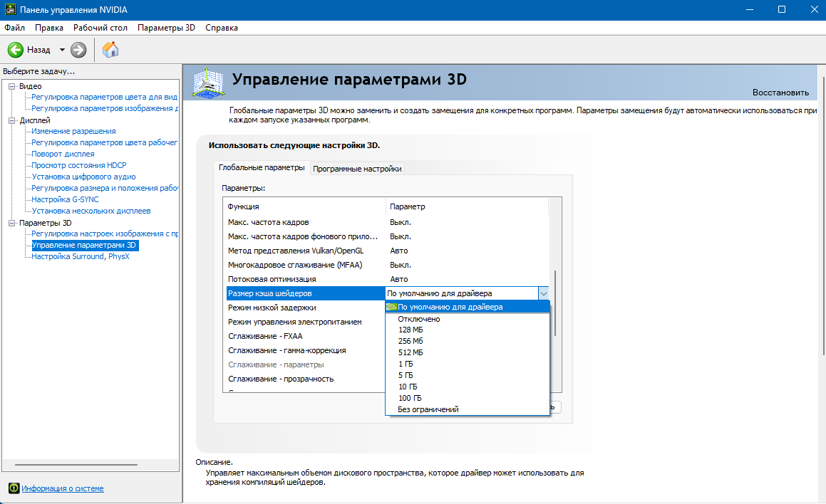 • Не ограничивайте размер кэша шейдеров. Например, для видеокарт GeForce эту настройку можно найти в Панели управления Nvidia.