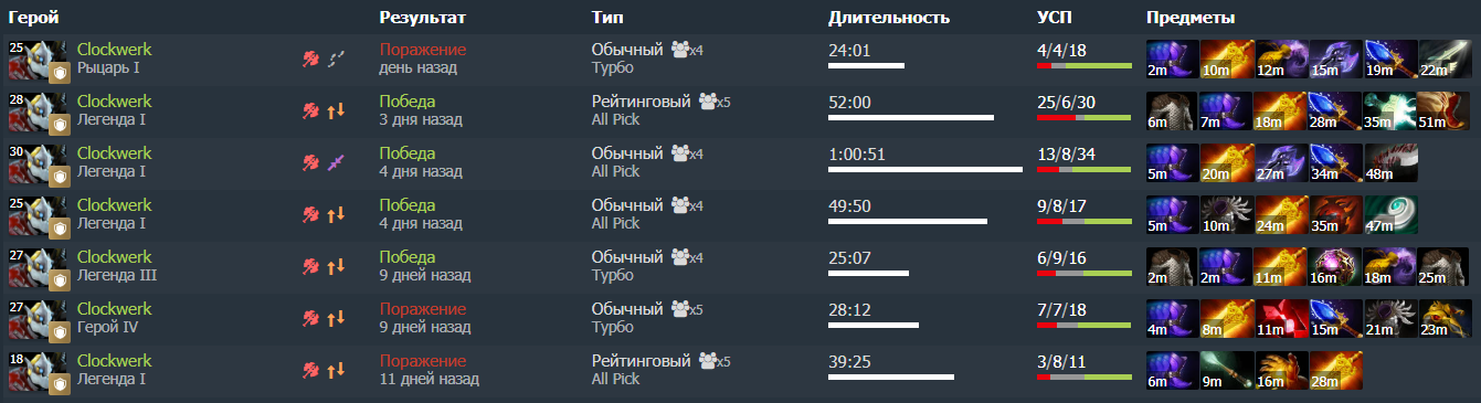 Я победил в четырех играх из семи, но скорее вопреки, а не благодаря. Клокверк – один из лучших моих героев, мне не составляет труда сделать на нем разницу на своей авераге. Даже на «старой» версии героя, без широких Power Cogs.