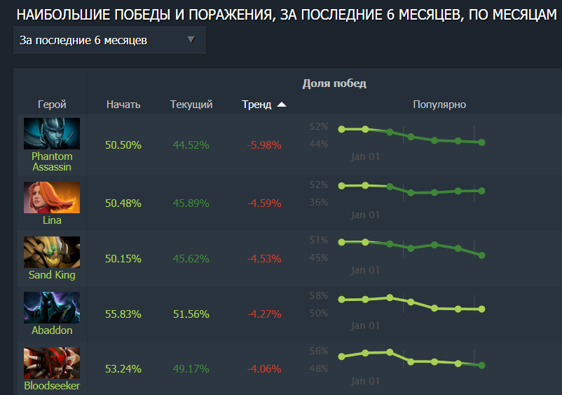 Возьмем, например, Фантомку. Героя нерфят уже 3 патча подряд, ее винрейт стремительно катится вниз. За полгода – с 50 до 44%.