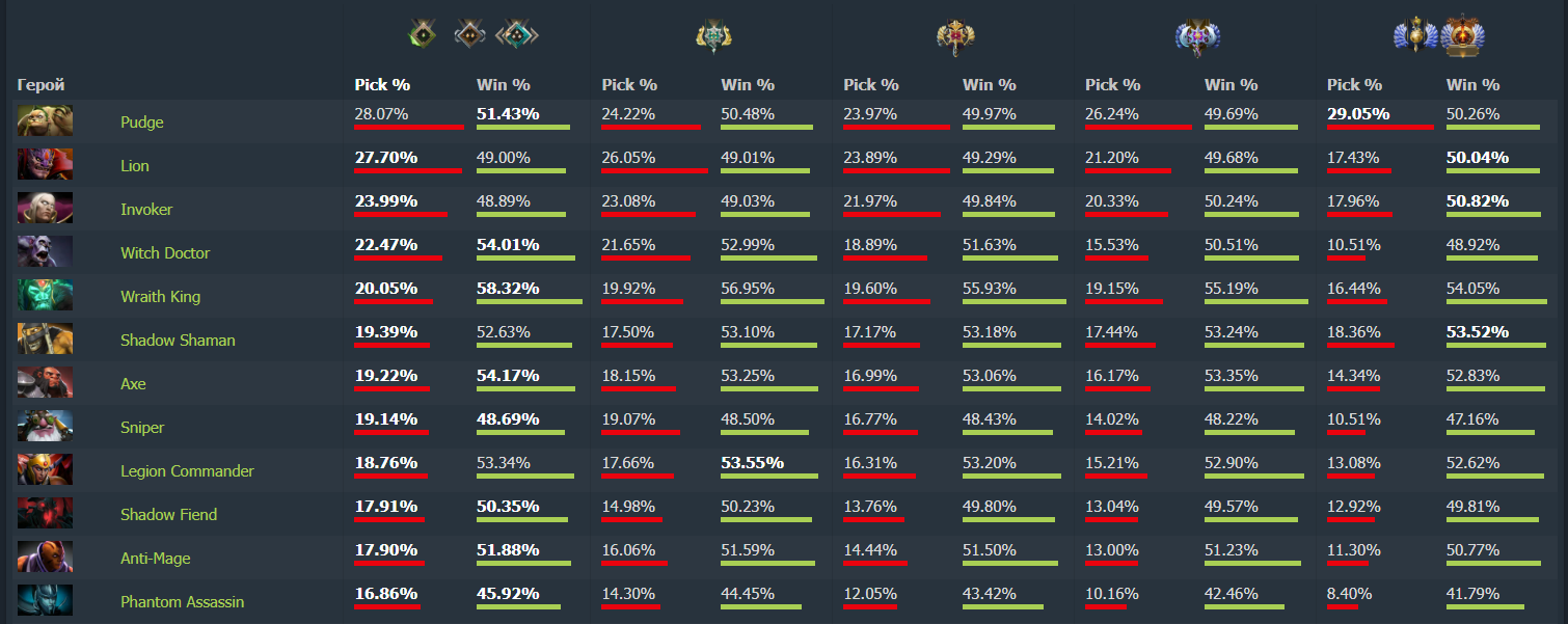 Но герой все еще в топ-12 по пикрейту на рангах «Рекрут», «Страж и «»Рыцарь». Ребята на этом MMR видят ПА каждую шестую катку – из традиционных керри-героев показатель выше только у ВК и Антимага.