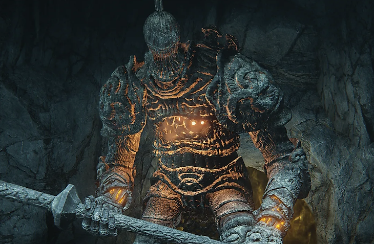 - «Рывок с алебардой» – голем втыкает оружие в землю и мчится вперед, после чего взмахивает алебардой, выбрасывая камни в игрока – чаще используется для сближения.