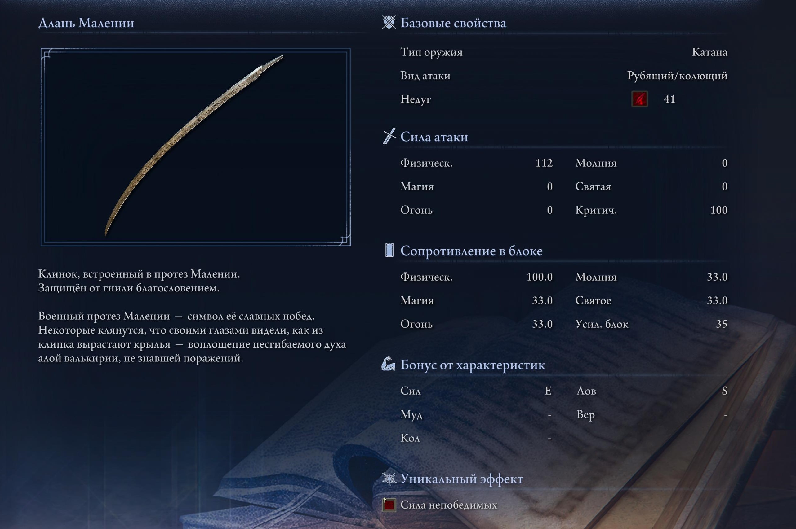 Длань Малении (легендарная катана): оружие с максимальным бонусом от Ловкости и эффектом кровотечения, идеально подходящее для агрессивного стиля боя. Его уникальный эффект – восстановление здоровья, если вы наносите удар сразу после того, как получили урон. Идеальный выбор для тех, кто сражается на грани и не боится рисковать.