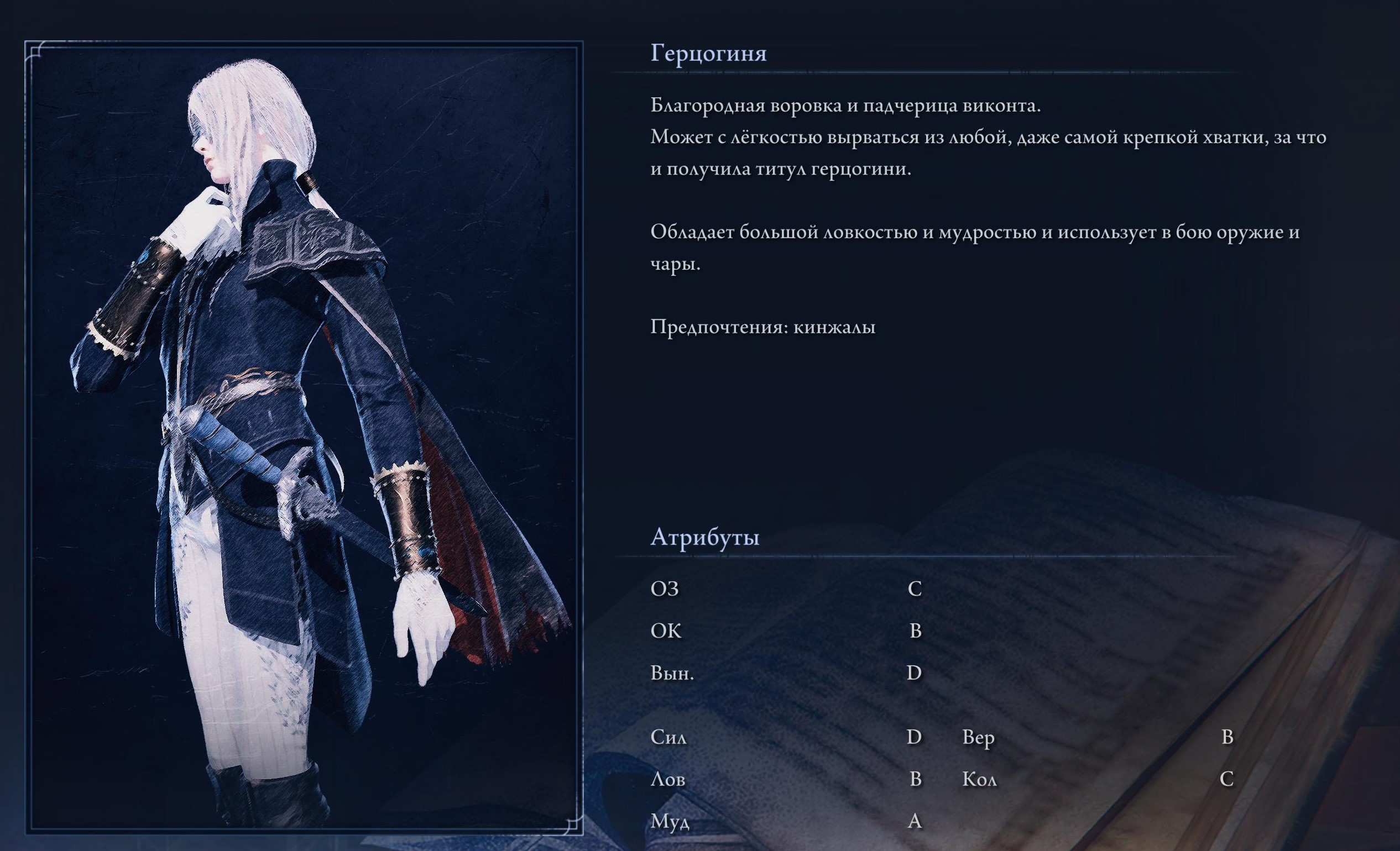 Герцогиня – типичный пример «хрустальной пушки»: ловкий и стремительный персонаж, чей боевой стиль строится на постоянных уклонениях и молниеносных атаках, способных нанести сокрушительный урон за считанные секунды. Благодаря высокому показателю Мудрости, она может эффективно сочетать физический урон с использованием заклинаний.