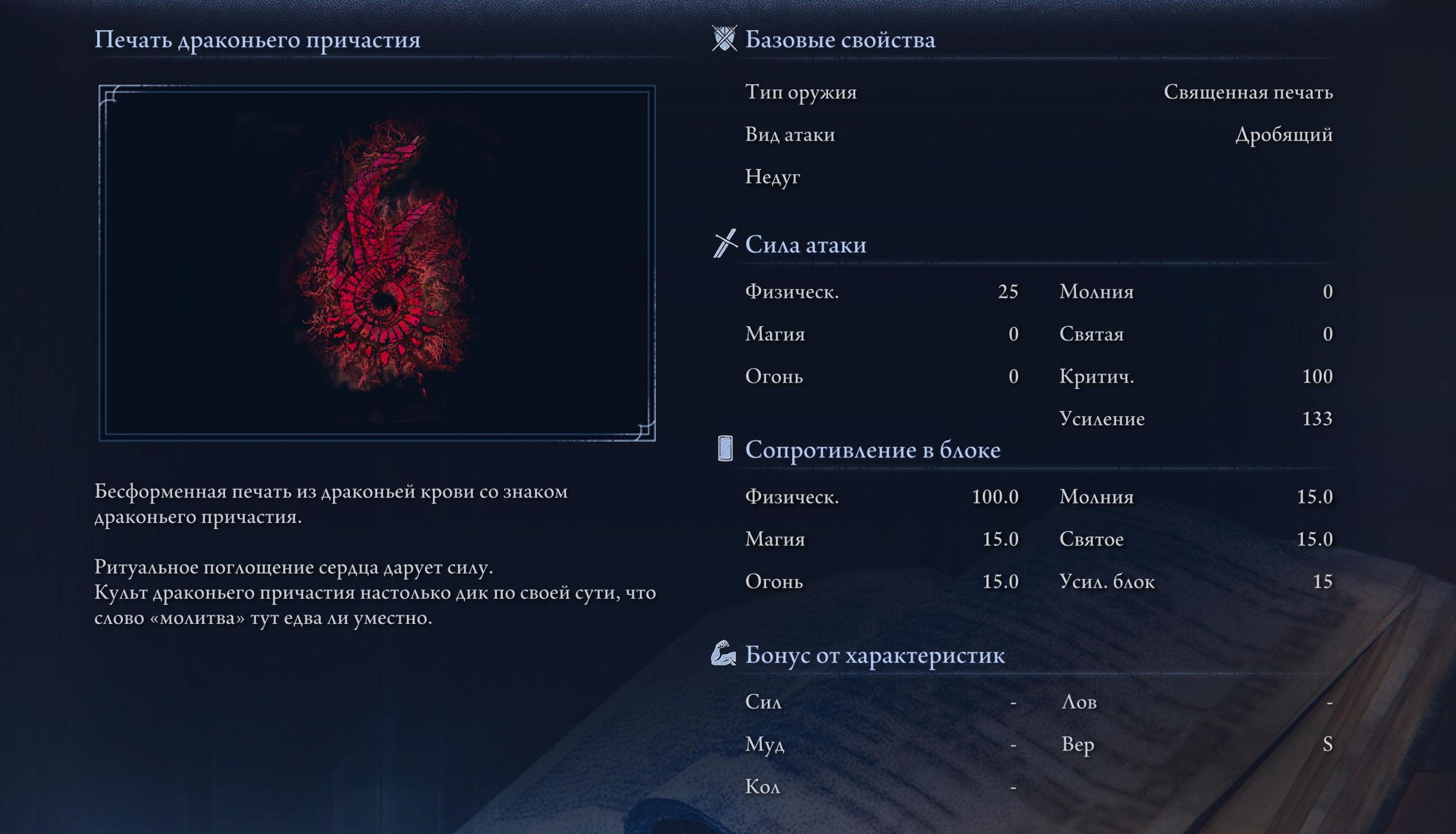 Печать драконьего причастия (эпическая священная печать): максимальный бонус от веры, плюс усиление драконьих заклинаний.